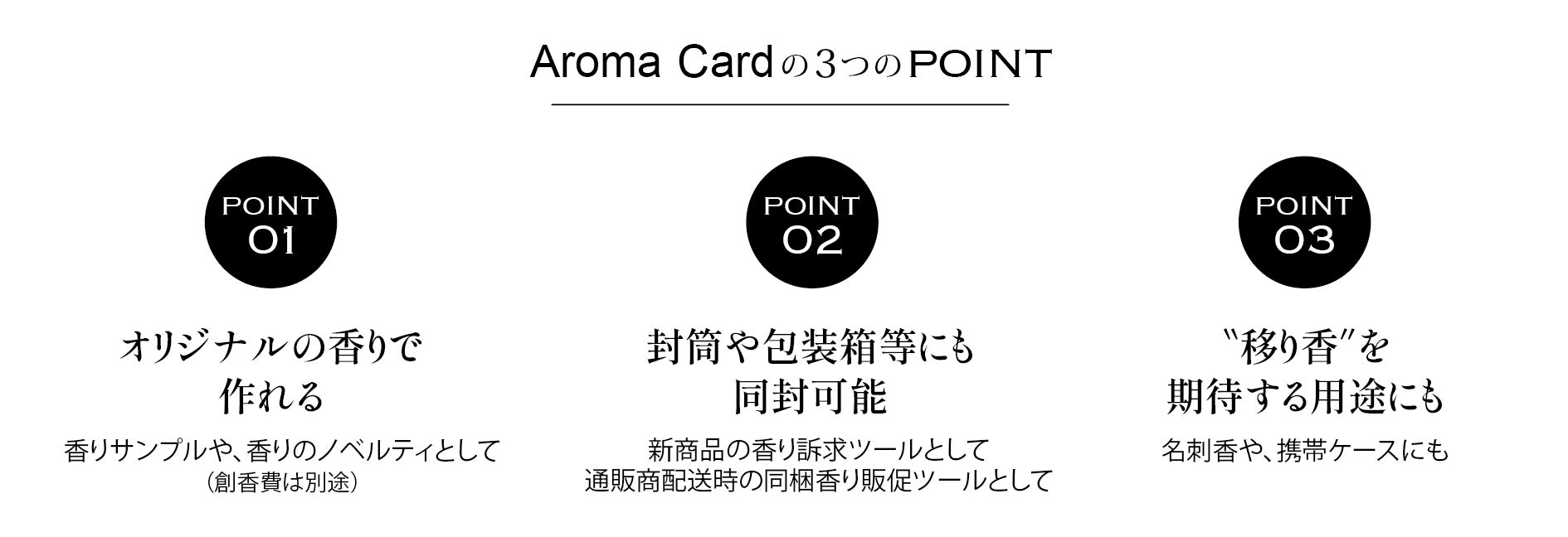 アロマカードは、貴社のオリジナルアロマを特製カードに染み込ませ、それをノベルティとしてお客様に配布したり、通販の配送時の箱や袋に封入することで、貴社ブランドをお客様の身近なものとし、ブランドの魅力を際立たせて、貴社ブランド名をお客様の記憶に確実に記憶させることができます。