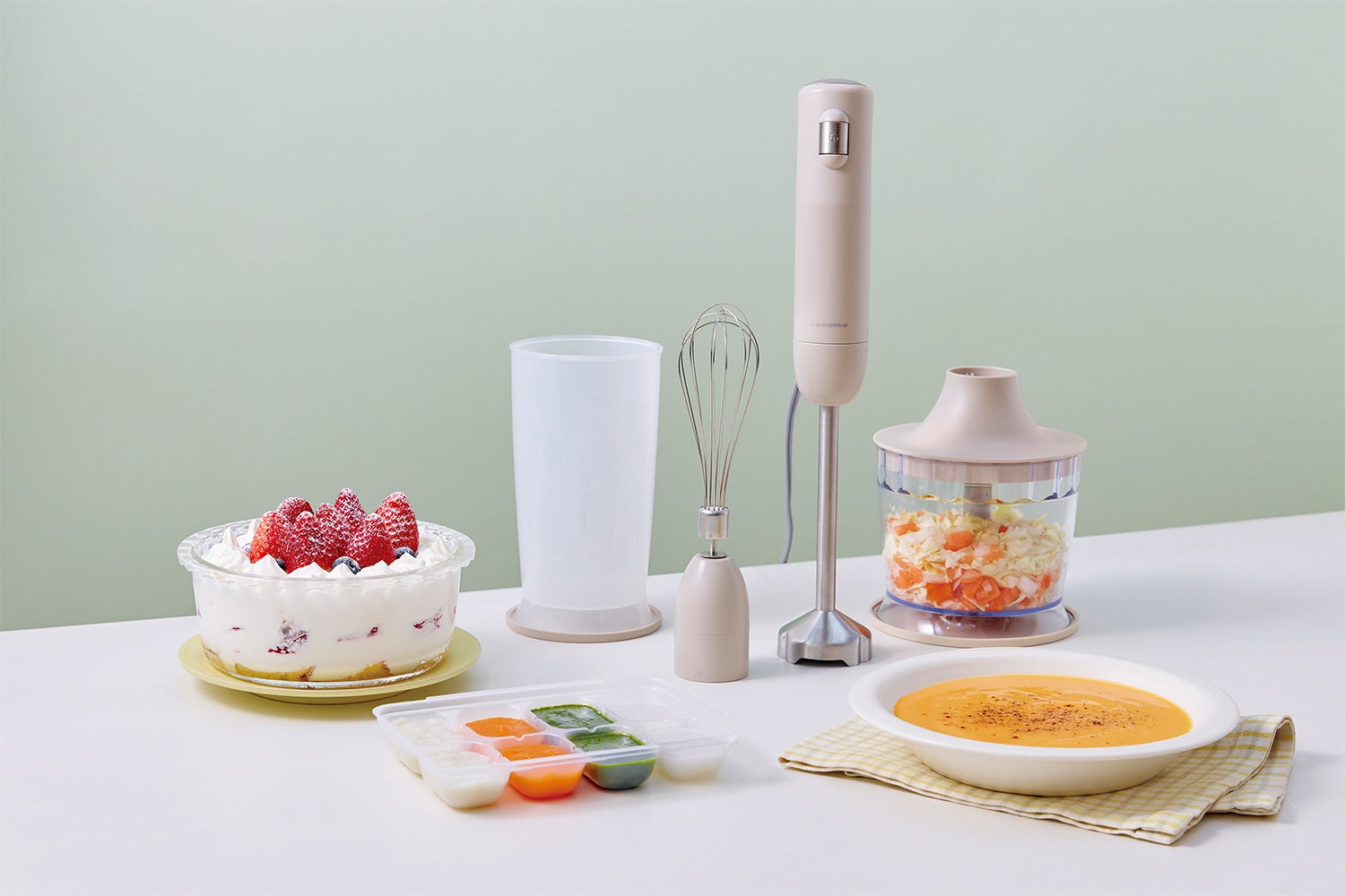 DCモーター搭載によりパワフルな調理性能を実現。「フルセット」は、ブレンダー、ホイッパー、チョッパーの3つのアタッチメントと専用カップが付属。「ベーシックセット」には、ブレンダーと専用カップが付属。これ1台で料理の下ごしらえからスムージー、スープ、お菓子作り、離乳食作りまで幅広く対応します。