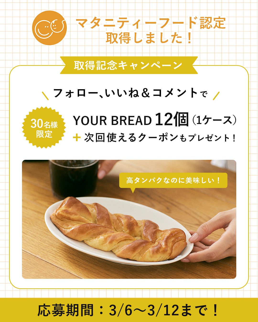 インスタグラムの公式アカウント @yourbread_jp をフォローし、該当の投稿にいいね&コメントしてくださった方の中から抽選で30名様に『YOUR BREAD 1ケース(12個入り)』をプレゼント!