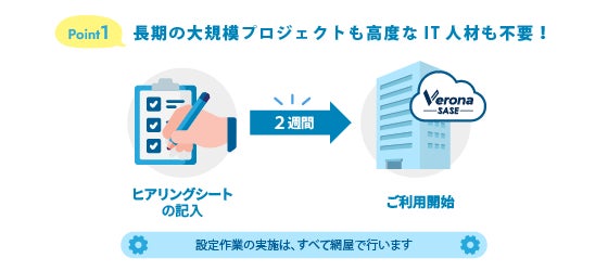 導入に必要なお客様作業は、ヒアリングシートの記入のみ。長期にわたる大規模なSASE導入プロジェクトの遂行不要で、最短二週間で簡単にSASEを導入できます。