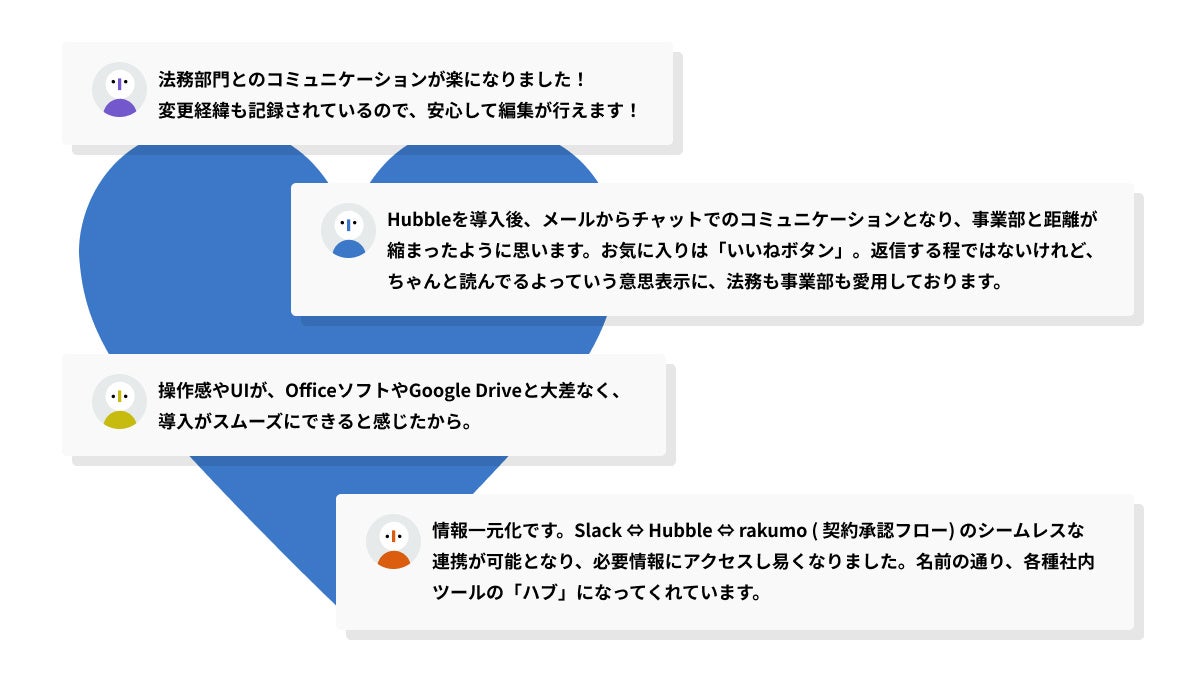 たくさんの方々に支えられ、法務をはじめとした企業の成長を契約業務の面から支援させていただきHubbleはここまで成長しました。いつも本当にありがとうございます。