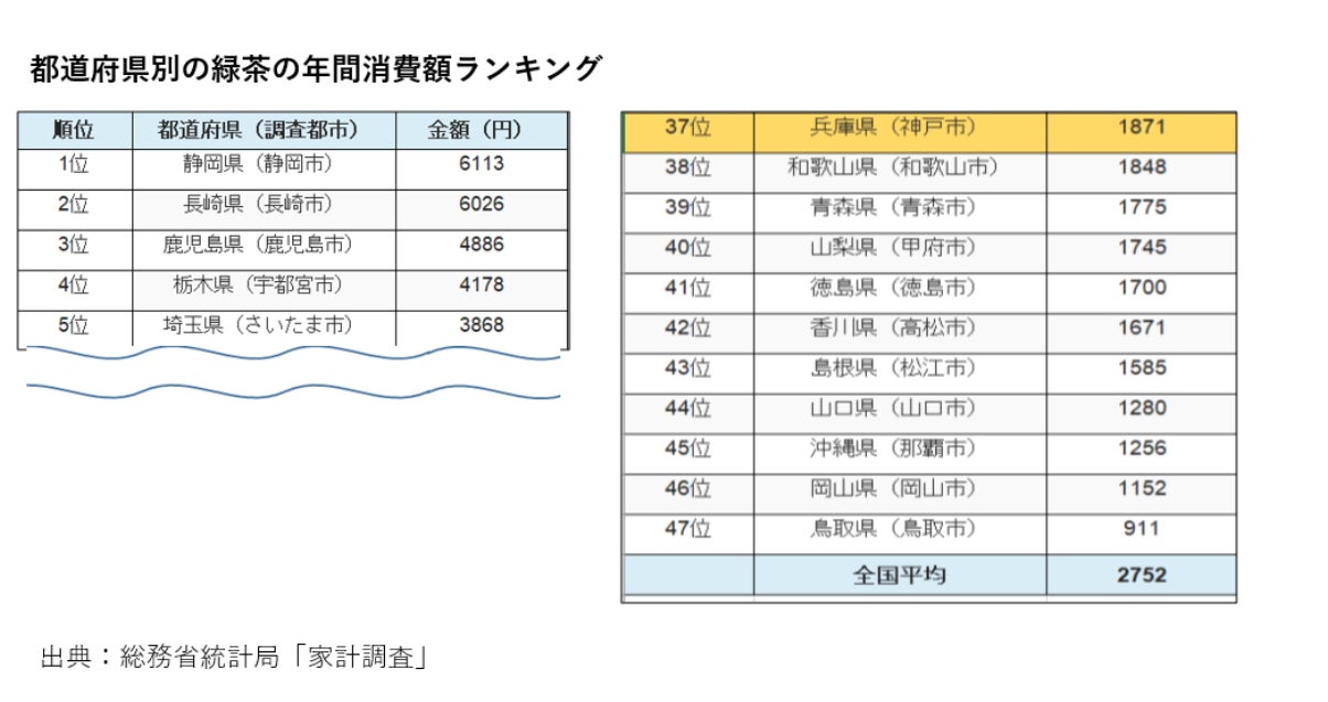 総務省統計局の「家計調査」の2020年の緑茶の年間消費額のデータによると、兵庫県(調査都市は神戸市)は1871円と全国平均2752円より低く、全国では37位と1家族の消費額が少ない傾向にあります。