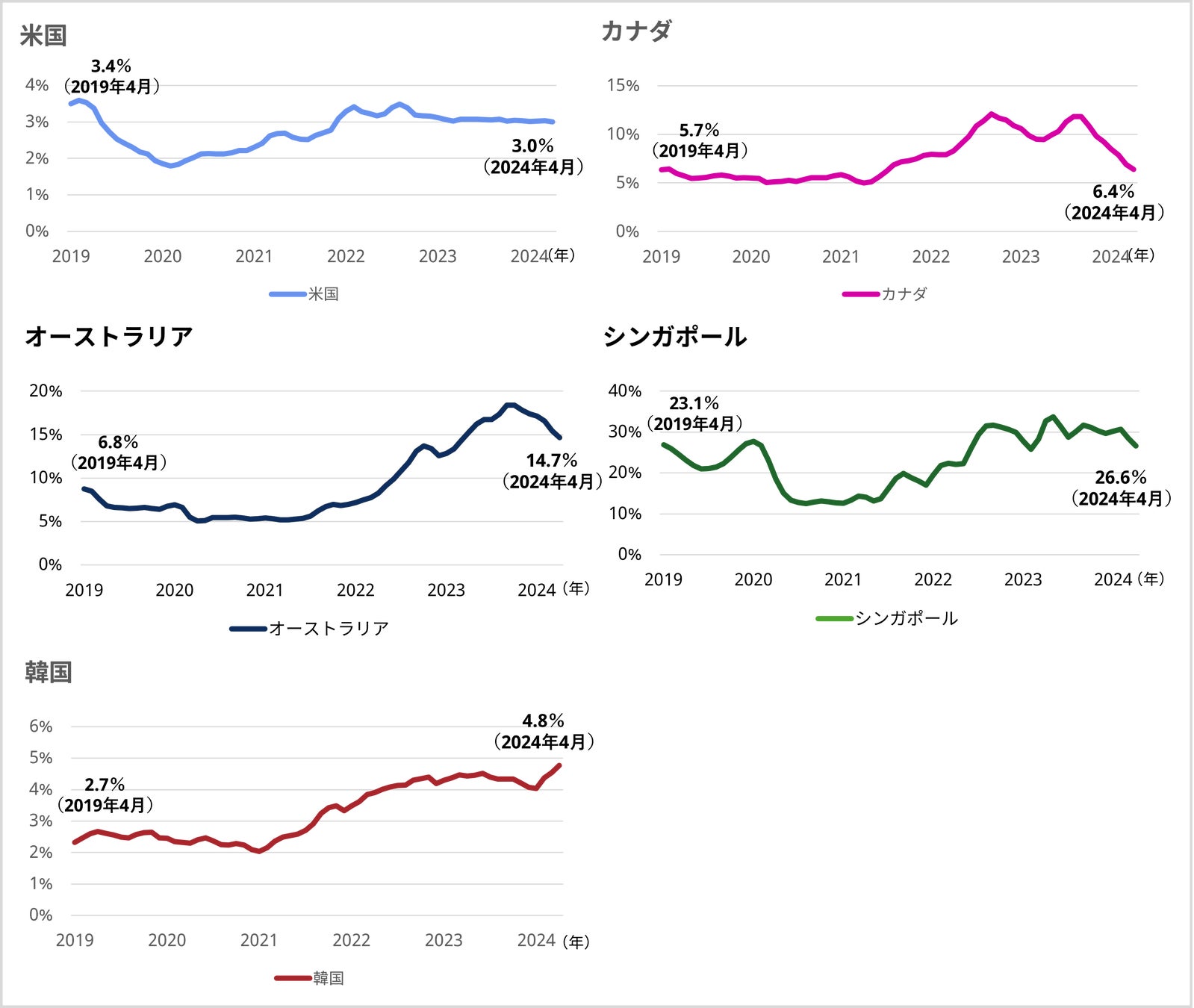 その結果、米国では2019年4月と比較し2024年4月は海外からの仕事検索割合は減少しています。一方、カナダ・オーストラリア・シンガポール・韓国では海外からの仕事検索割合は、2024年4月はコロナ禍前の水準と同等またはそれ以上となっています。