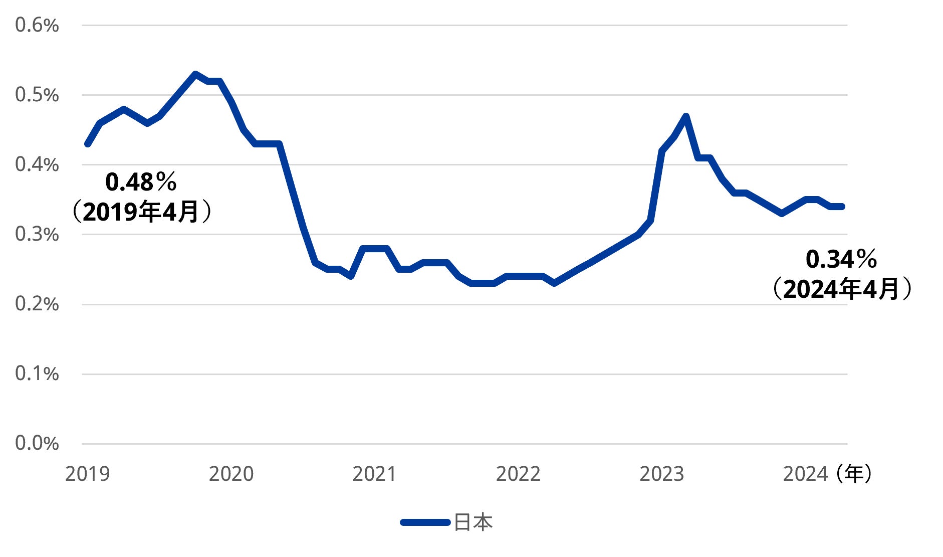 「海外から日本」への仕事検索割合はコロナ禍を経て回復傾向であるものの、コロナ禍前の水準を下回っています。Indeed上の日本の全仕事検索に占める海外からの仕事検索割合は、2019年4月は0.48%であったのに対し、2024年4月は0.34%と、約3割(29.2%)減少しています。