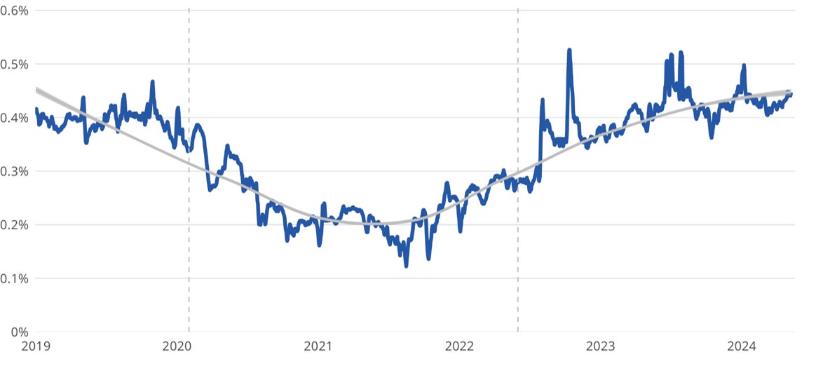 データは7日移動平均、2019年1月1日-2024年5月8日。季節調整済。灰色線はトレンド線。