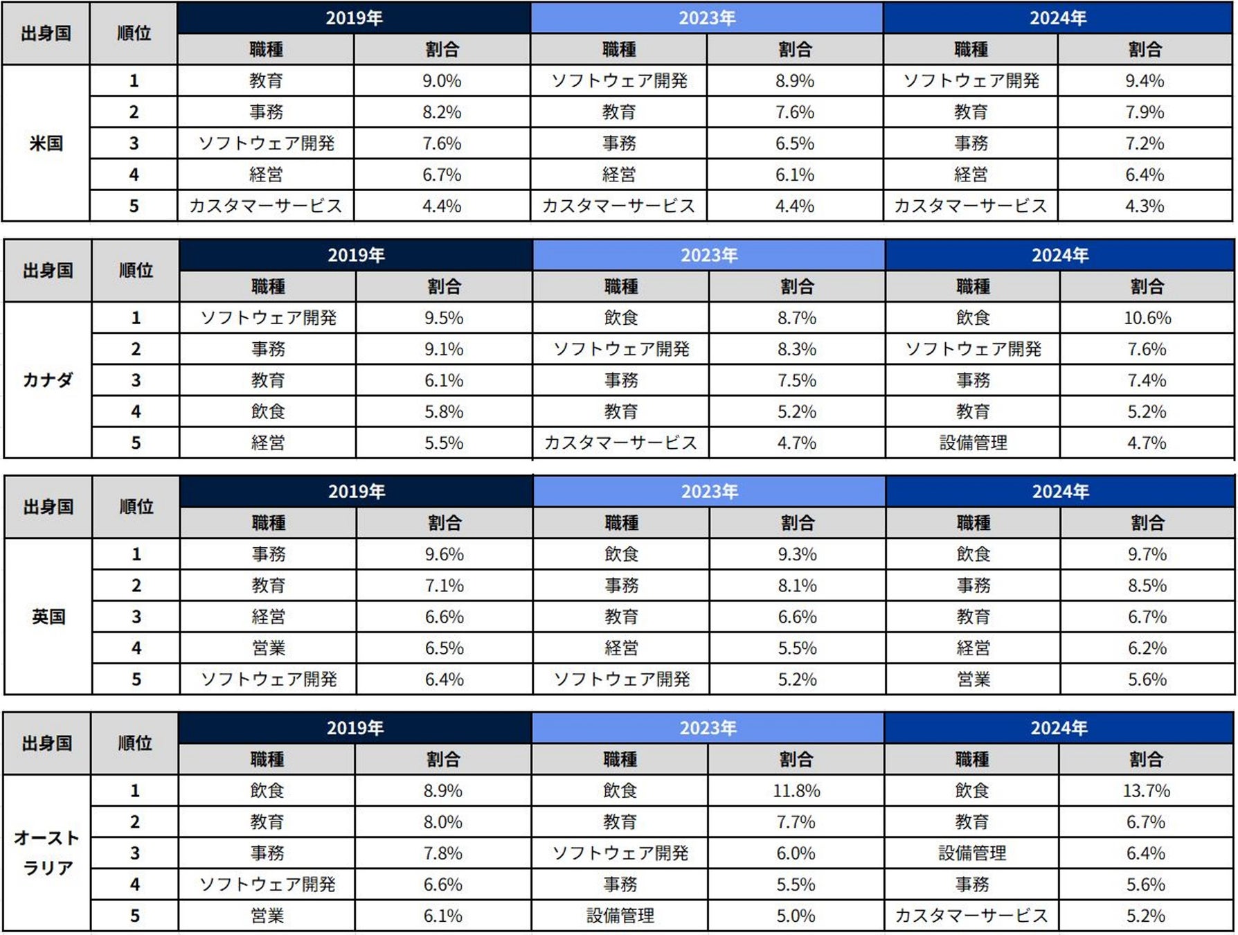 職種カテゴリ別の関心を見ると、2023年と2024年(1〜4月)は米国では「ソフトウェア開発」、カナダ・英国・オーストラリアでは「飲食」がそれぞれ1位となっている。