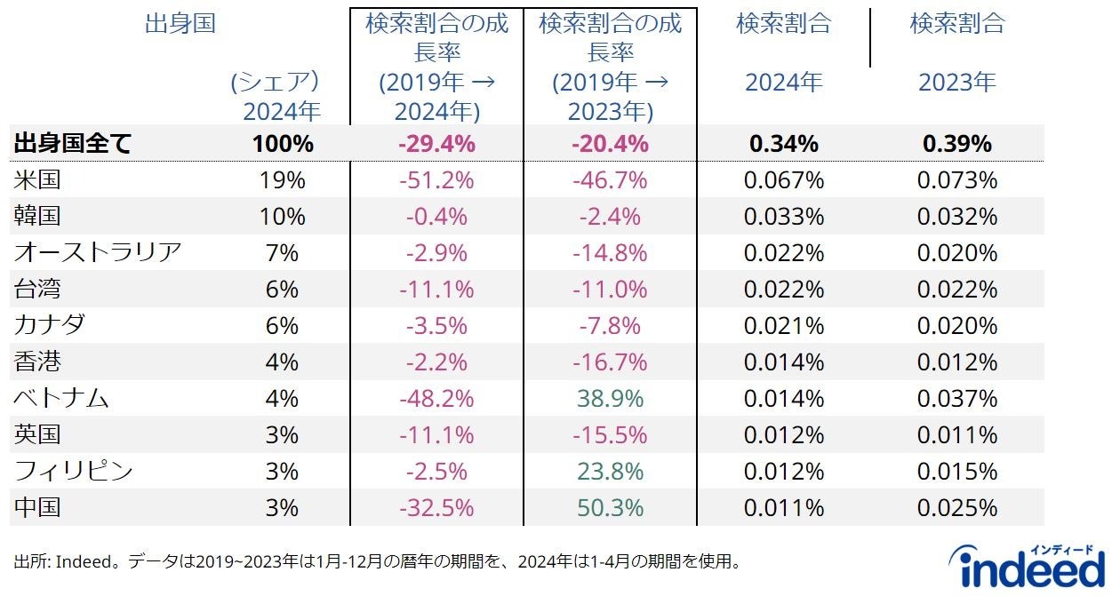 Indeed、越境仕事検索の動向を調査。「海外から日本」への仕事検索割合、2019年と比較し2024年は上位10カ国・地域全てで減少。米国、ベトナムからは約5割減少。