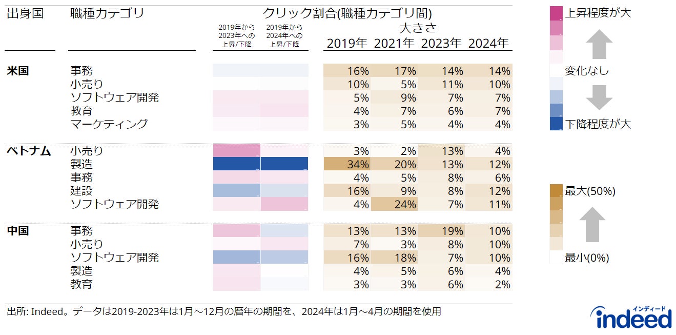Indeed上で2024年の「海外から日本」への仕事検索割合が最も高い米国と、日本の外国人労働者の出身国上位2カ国のベトナム・中国(※1)それぞれの求職者について、日本の求人への職種別の関心を明らかにするため、求人の職種カテゴリ別のクリック割合を分析しました。各国で2023年にクリック割合が高かった上位職種カテゴリ5つを比較すると、特にベトナムからの職種カテゴリの関心に大きな変化が見られました。ベトナムの「製造」へのクリック割合は2019年は34%であったのに対し、2023年は13%と大きく減少しました。2024年は、1〜4月までの限定的な結果となりますが、12%となっており減少傾向が続いていると見られます。一方で「ソフトウェア開発」への関心は2019年の4%から2023年には7%に増加しており、2024年(1~4月)では11%と増加傾向にあります。米国ではベトナム同様に「ソフトウェア開発」への関心は増加していますが、中国では減少傾向です。