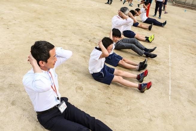 腕立て伏せ状態や地面に座った状態からのよーいドン。瞬発力を高める練習では、ジェイ・エス・ビーのスタッフも一緒に奮闘しました。