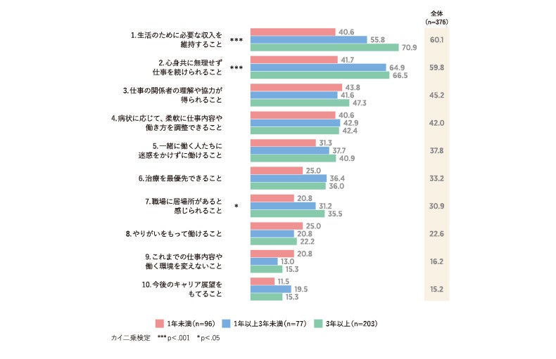 ・一方、1年未満群は上記2項目の選択率は約4割にとどまり、「3.仕事の関係者の理解や協力が得られること」(43.8%)が最も多く、「4.病状に応じて、柔軟に仕事内容や働き方を調整できること」といった人間関係や業務遂行の維持が同じく約4割選ばれている。