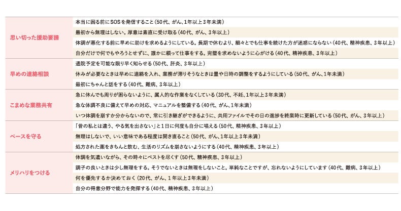 Q.適切な治療をしながら自分の望む就業を続けるために、あなたが心がけている「コツ」「工夫」があれば、具体的に教えてください。 〈自由記述から抜粋〉