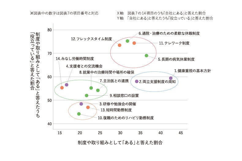 ・一方、その他の8施策は、導入が約2割前後とあまり高くない。しかし、そのうちの「4.支援者との交流機会」「14.みなし労働時間制度」「8.就業中の治療時間や場所の確保」「7.主治医との連携」「9.相談窓口の設置」は(緑で囲んだゾーン)、約5割が「役立っている」としている。