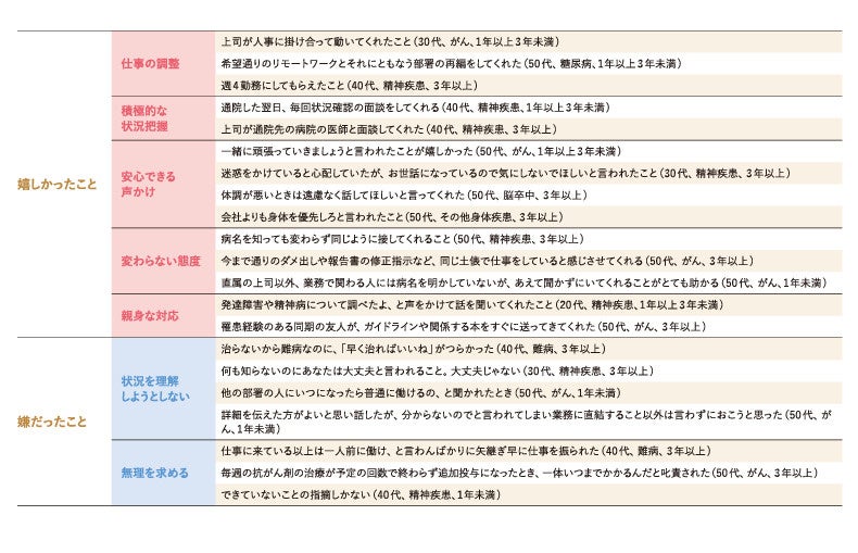 ⇒発病して初めて、通院や治療の時間を調整したり職場の理解を得たりするにあたり、会社が方針を示していることは大きな支えと感じられるのだろう。