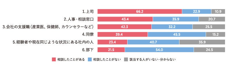 ・一方、「4.同僚」「5.経験者や現在同じような状況にある社内の人」「6.部下」は39.4%、23.4%、21.5%とより少なく、「相談したことがある」より「相談したことがない」が多かった。