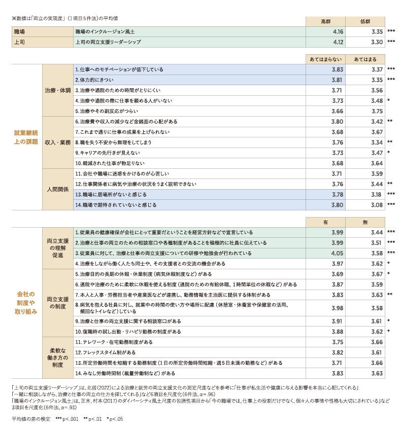 ・特に強い影響が確認されたのは、「上司の両立支援リーダーシップ」(「仕事が私生活や健康に与える影響を本当に心配してくれる」など6項目、6件法、α=.96)と、「職場のインクルージョン風土」(「今の職場では、仕事上の役割だけでなく、個々人の事情や性格も大切にされている」など3項目、6件法、α=93)である。それぞれについて、高群と低群の「両立の実現度」を比較したところ、高群が低群にくらべて有意に高い結果が見られた。