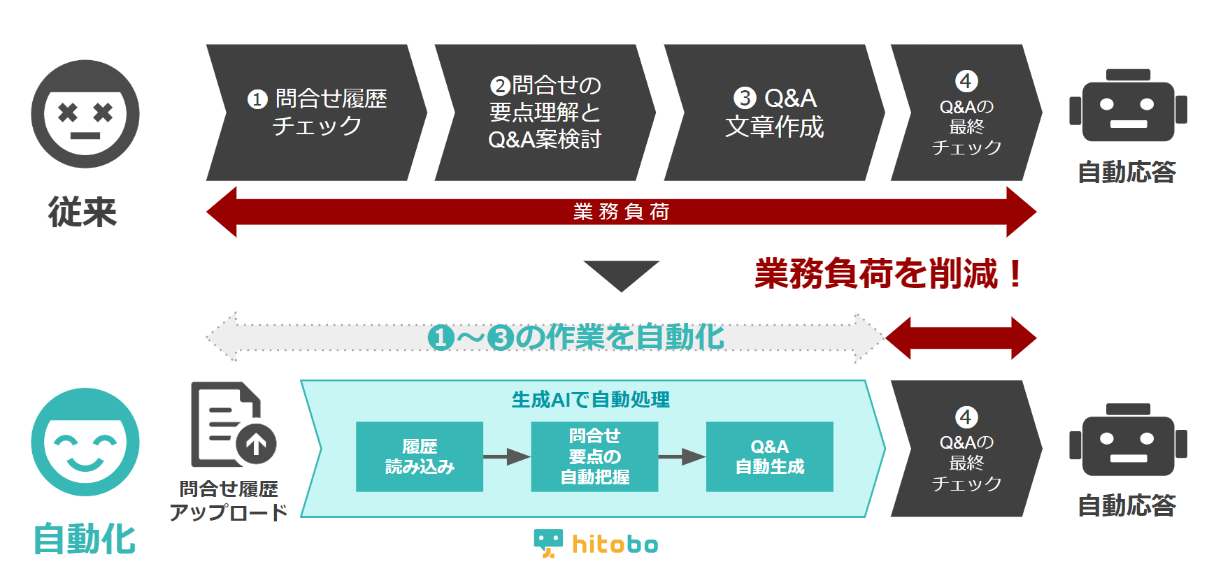 - 問い合わせ対応履歴からQ&A生成し作成工数を1/15(※3)に削減