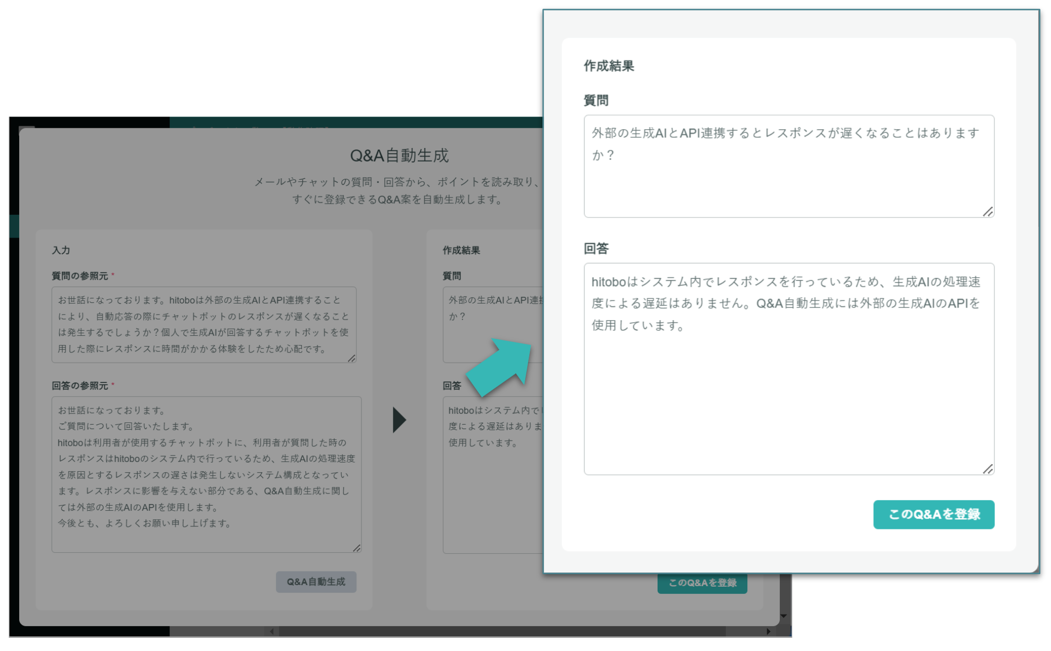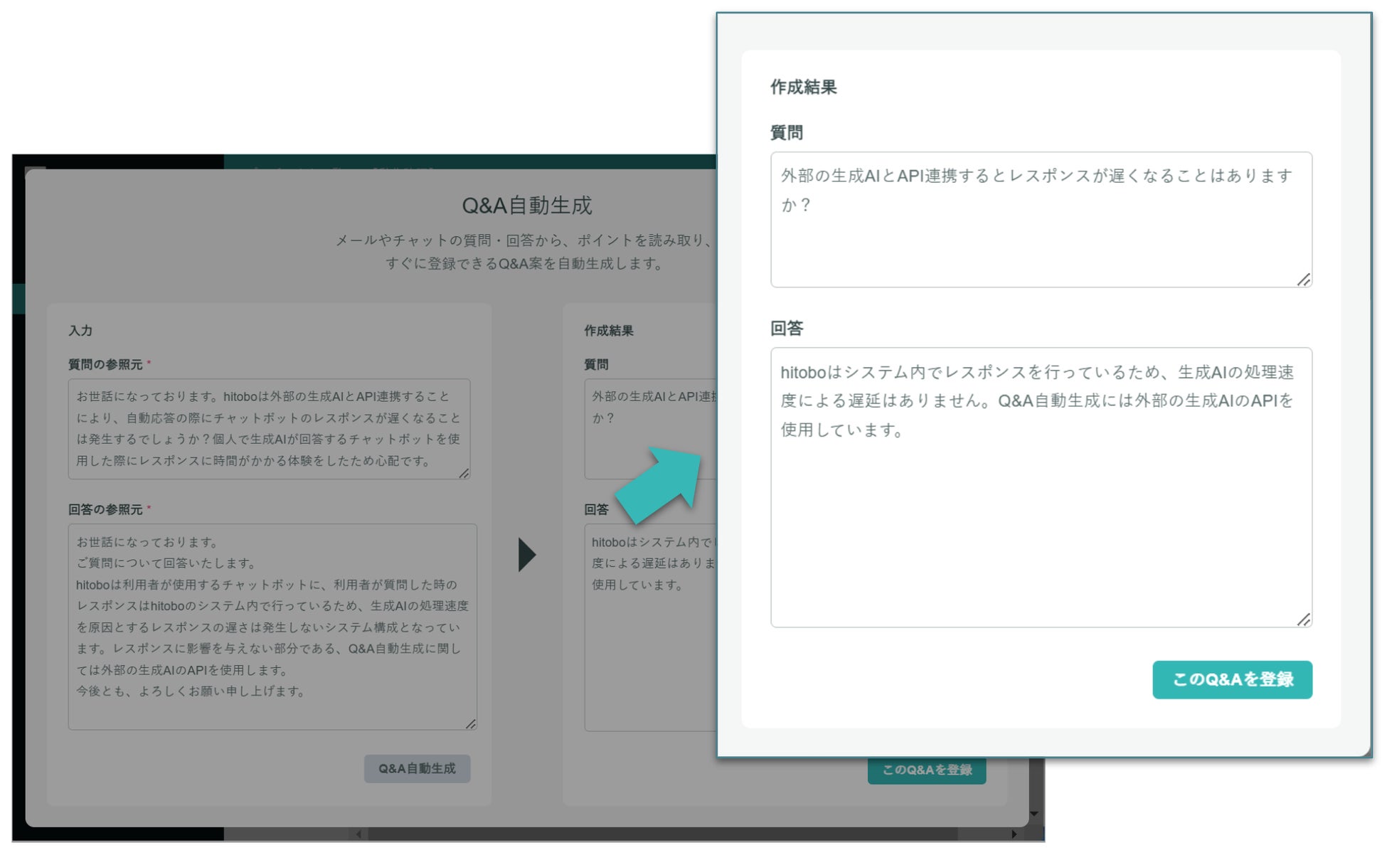 | 【ポイント】 ■hitoboにChatGPT API連携したことによる効果 ・「目視による問い合わせ対応履歴の確認」にかかる時間の削減。 ・「Q&Aの文章作成」にかかる時間の削減。 労働集約的な業務を、高度な自然言語処理を用いて自動化を実現し、業務効率化につなげます。 ■ChatGPT APIとhitoboの連携だからこそ実現できること ・ChatGPT API連携による「Q&A自動生成」により、「自社の固有情報を反映したQ&Aの一覧」の一括生成ができ、実用的なQ&A文章作成の自動化を実現。 ・hitobo管理画面上でQ&A自動生成から公開前の確認、チャットボットに反映まで完結。 ・応答時はAPIを経由しないことによりChatGPT API処理時間の影響を受けないため、「利用者へ即時応答」を維持。 |