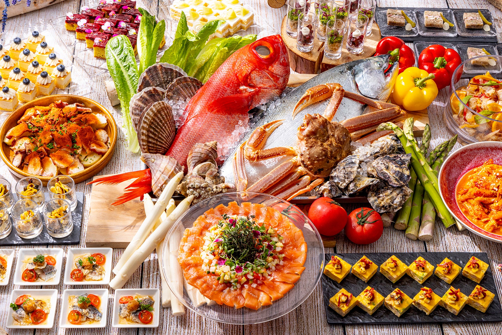 前菜には海鮮の宝庫である北海道を存分にお楽しみいただけるラインアップをお届け。脂がよくのった北海道産の時鮭をさっぱりとしたソースで仕立てた「北海道産時鮭のマリネ 数の子入りラヴィゴットソース」や、幻のカニとも呼ばれる稀少な花咲カニを中華風にアレンジした「花咲カニと卵のチリソース」など計8種類をビュッフェ形式でご用意。さらにズワイガニのクラブステーションに加え、メロンやラベンダーが香る、初夏にぴったりの爽やかなスイーツ5種も心ゆくまでお楽しみください。