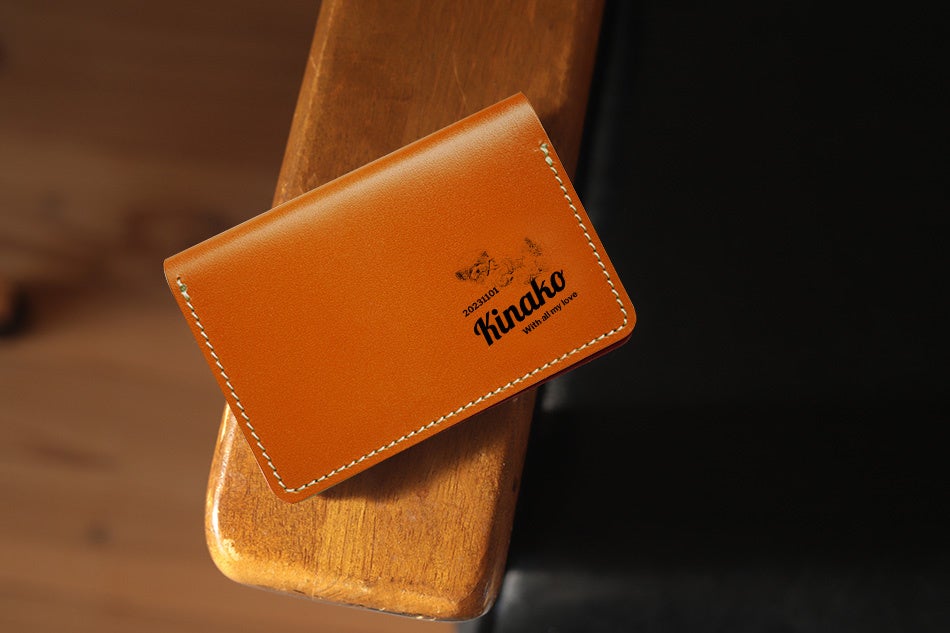 好きなパターンを選び、LINEで写真を送るだけで簡単にオリジナルのロゴを作成。ロゴが入ったミニ財布やカードケースは、革職人が上質な栃木レザーを使い全てハンドメイド。