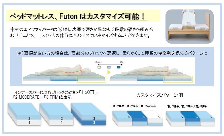 硬さが異なる3分割構造のエアファイバー®を入れ替えることで、カスタマイズが可能な機能性ベッドマットレス。一人ひとりの体形に合わせて理想的な寝姿勢を実現します。