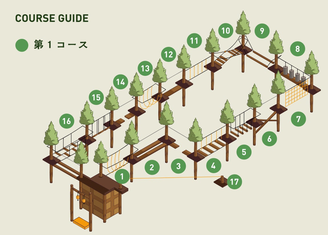 アスレチック基本コース:第1コース、第2コースのエレメントを何度でも利用できるコースプラン (所要時間 約120分)