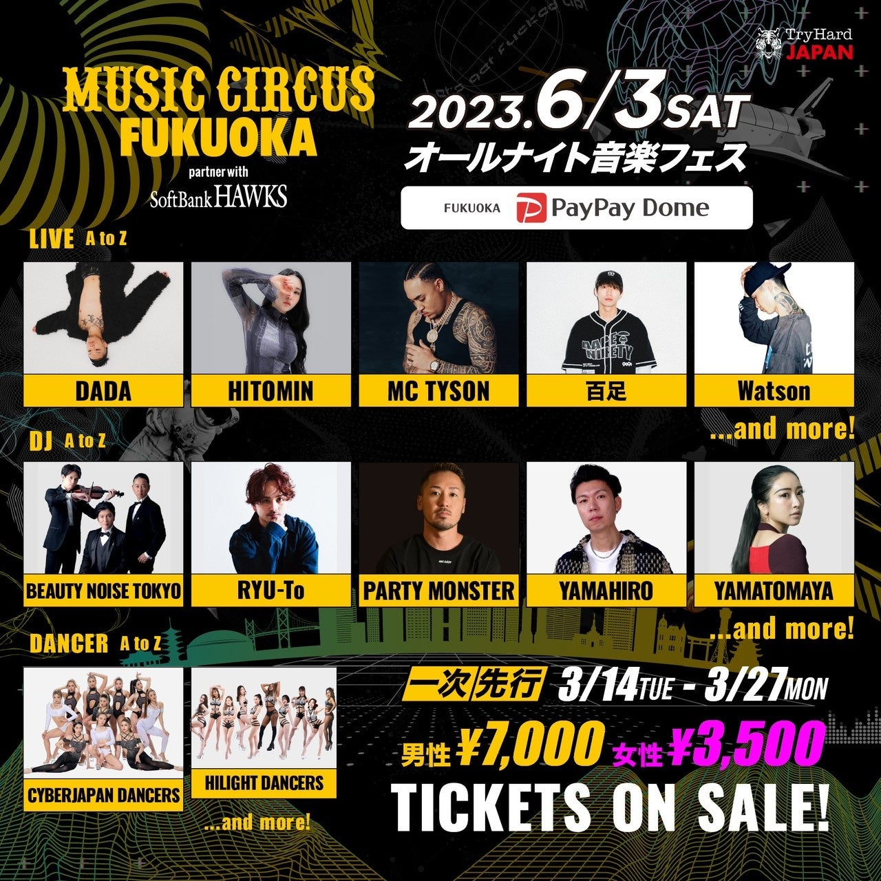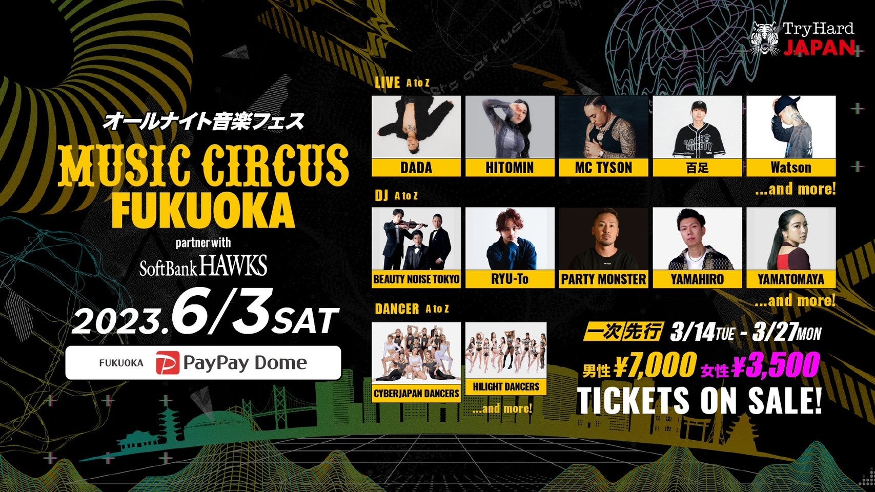 株式会社トライハードジャパン(所在地:大阪市中央区)と福岡ソフトバンクホークス株式会社(所在地:福岡市中央区)は、音楽フェスティバル「MUSIC CIRCUS FUKUOKA partner with SoftBank HAWKS」(以下本公演)の第一弾出演アーティストを発表いたします。