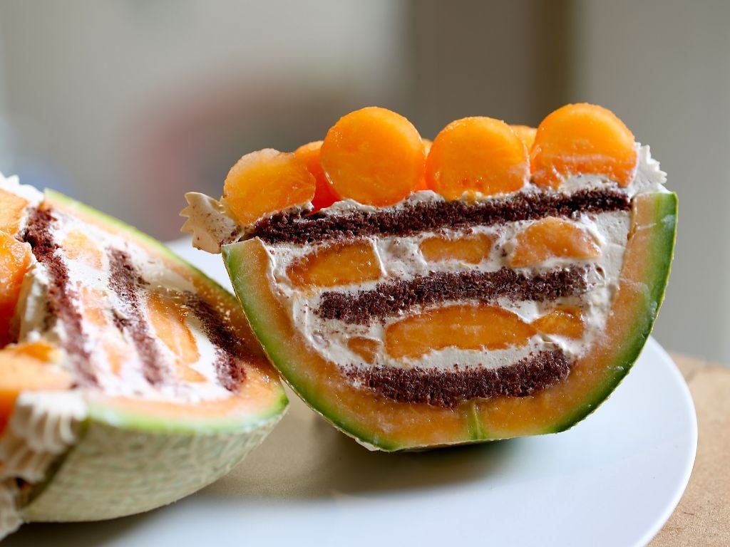 卵・乳製品・小麦粉を使わず、果実の美味しさを最大限に引き立てるソイホイップとグルテンフリーチョコレートスポンジを重ね、まるごと1個のメロンを贅沢に味わっていただける仕様にしています。