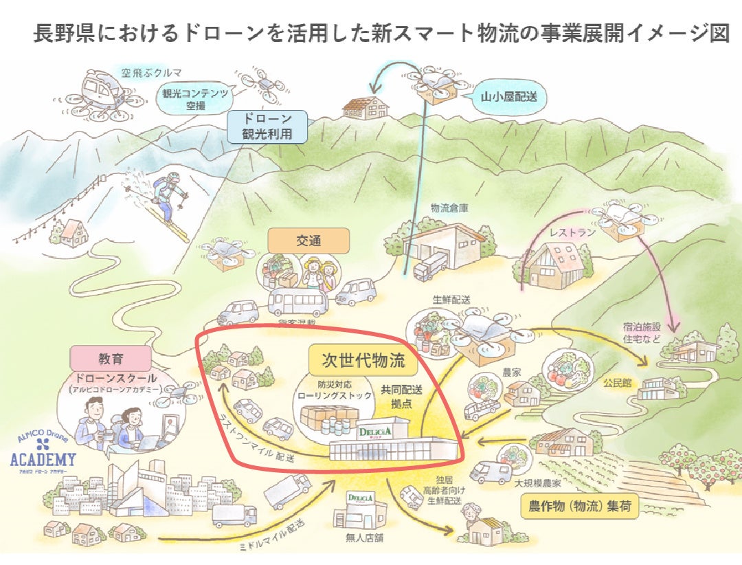 アルピコHD、セイノーラストワンマイル株式会社(セイノーHD傘下)、エアロネクスト、NEXT DELIVERYは本年2月に新スマート物流の長野県全域への拡大と地域課題の解決や地域経済の活性化に向け業務提携を締結しており、その具体的な活動の一環となります。