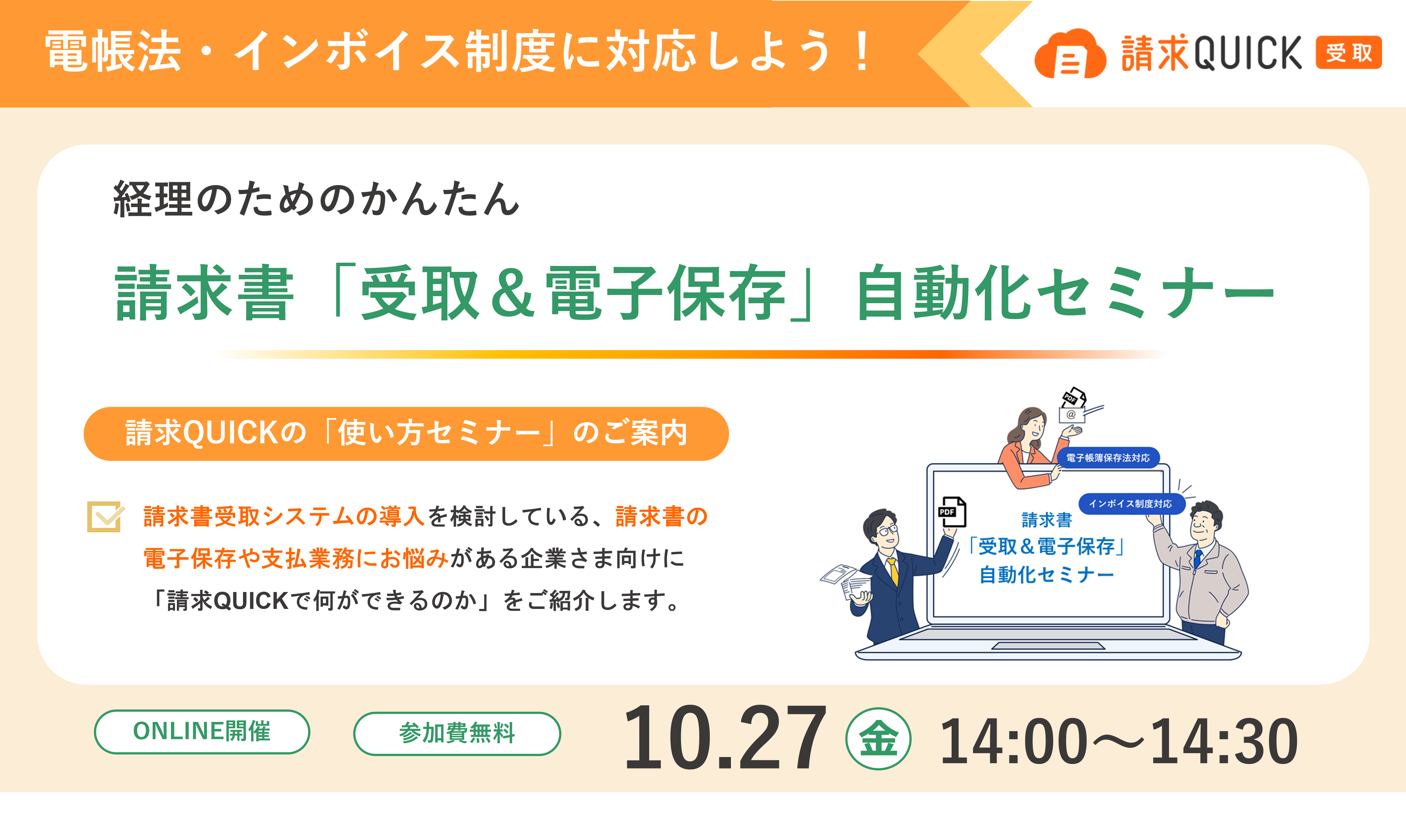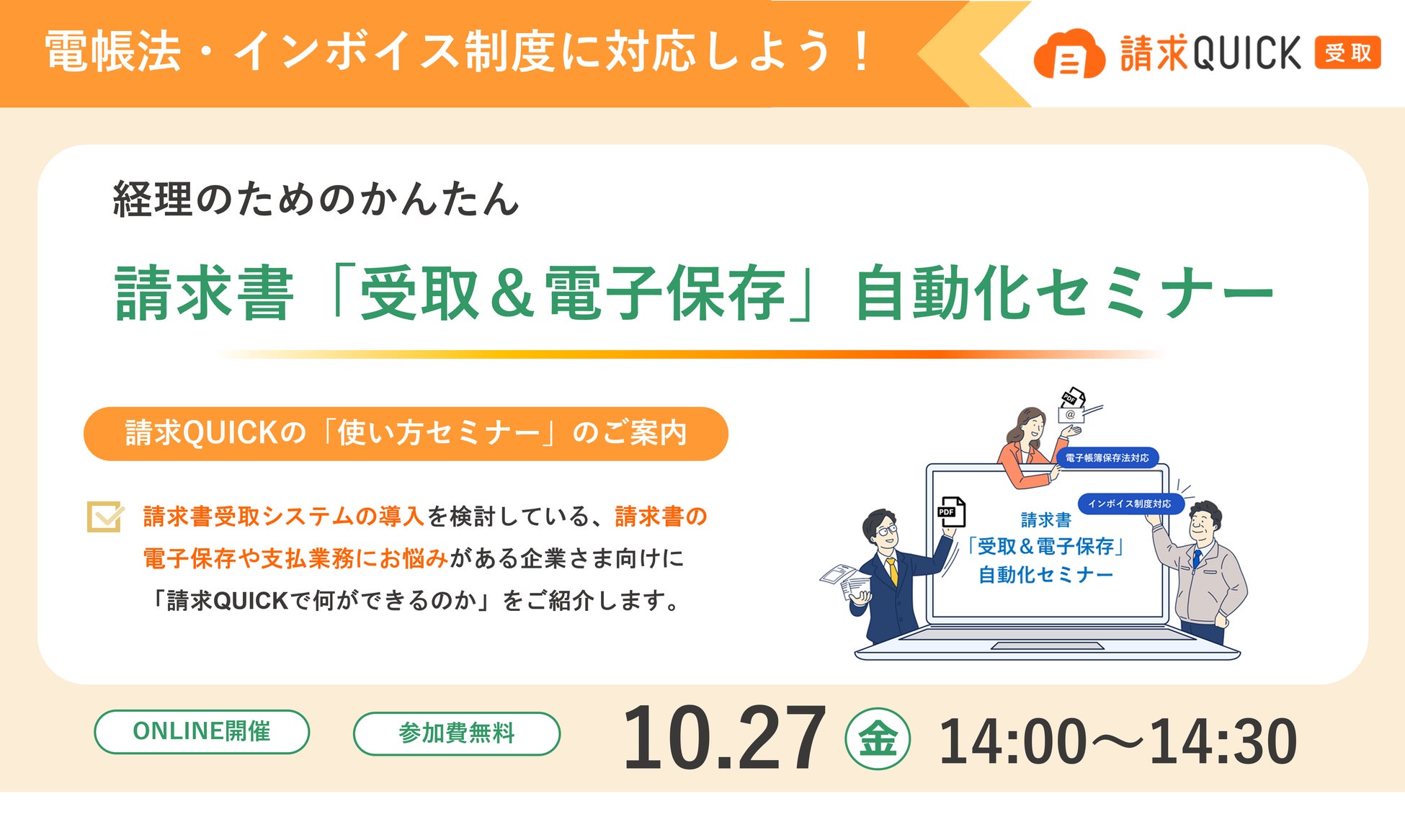 「請求QUICK」で電帳法・インボイス制度に対応しよう!経理のためのかんたん請求書「受取&電子保存」自動化セミナーを10月27日に開催