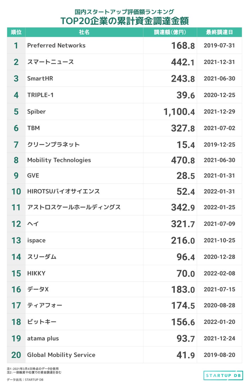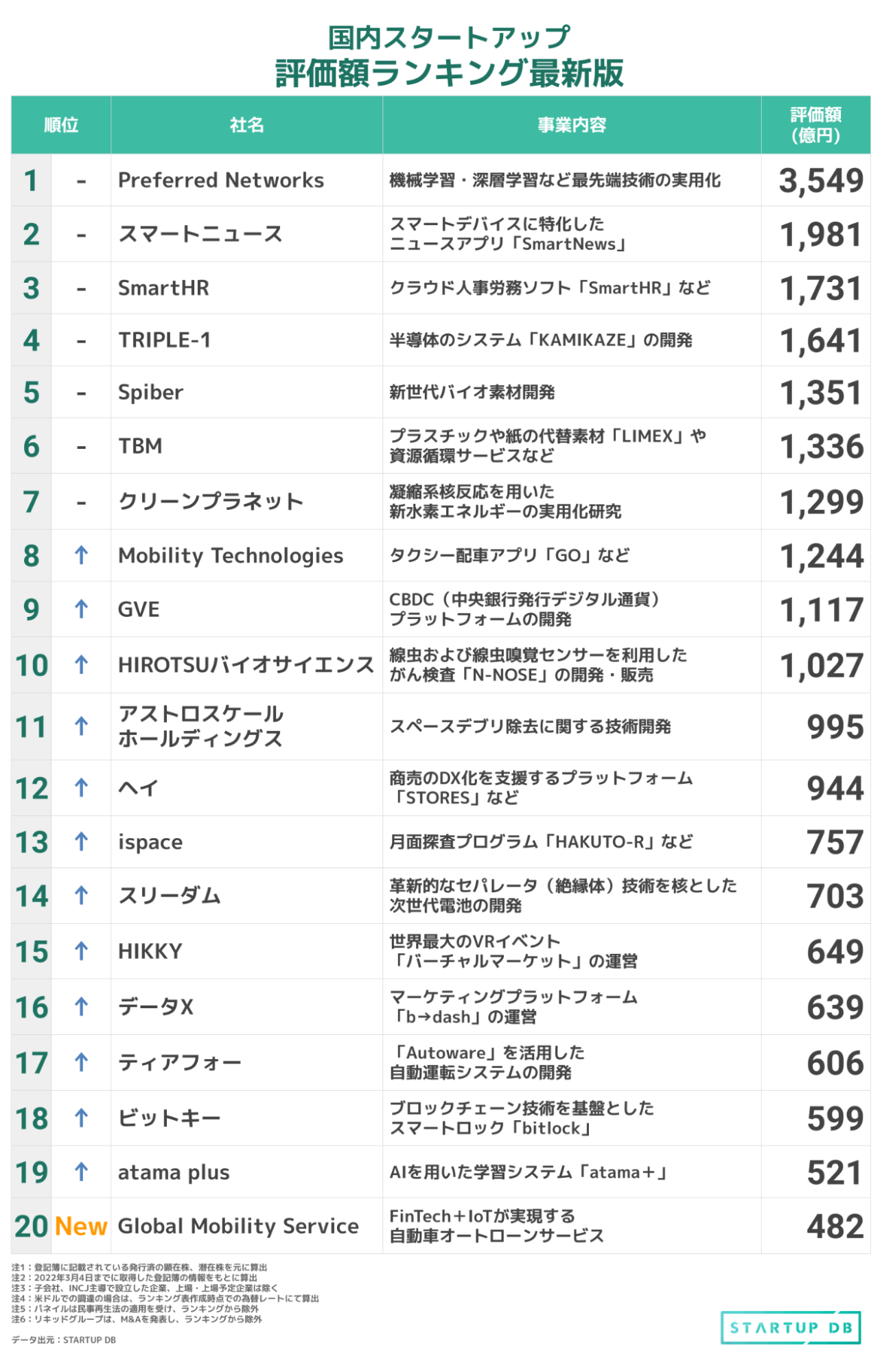 【STARTUP DB】調査結果 国内スタートアップ評価額ランキング最新版(2022年3月)