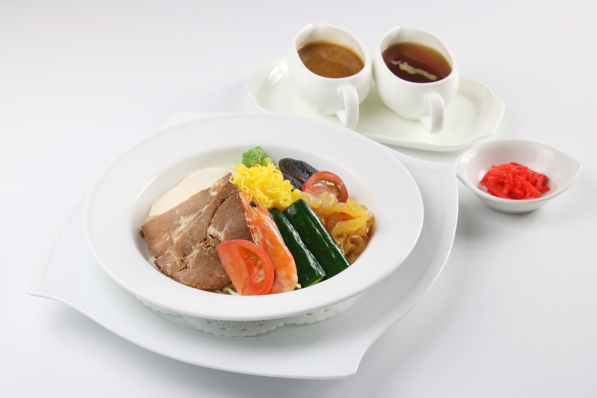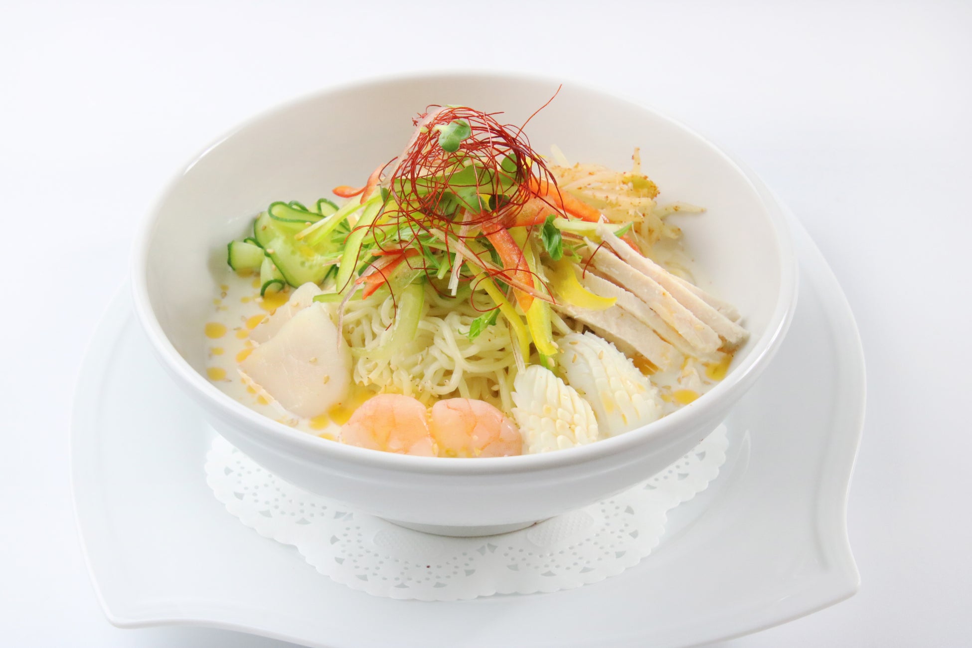 チャーシュー、海老、白鶏、クラゲ、野菜などの具材がたっぷりの夏の定番人気麺です。2 種類のソースでお楽しみください。