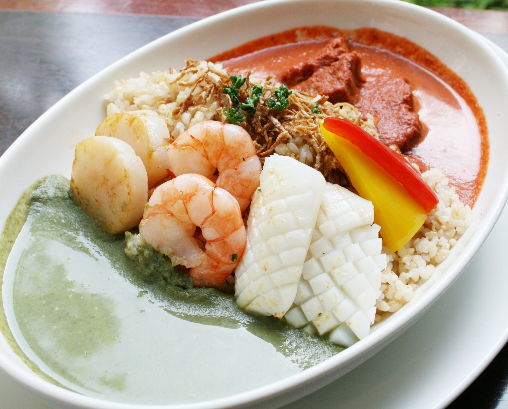 海老、帆立、イカなどのシーフードと牛肉の煮込みが入った贅沢なカレーです。*白米またはJシリアルライスよりお選びいただけます。