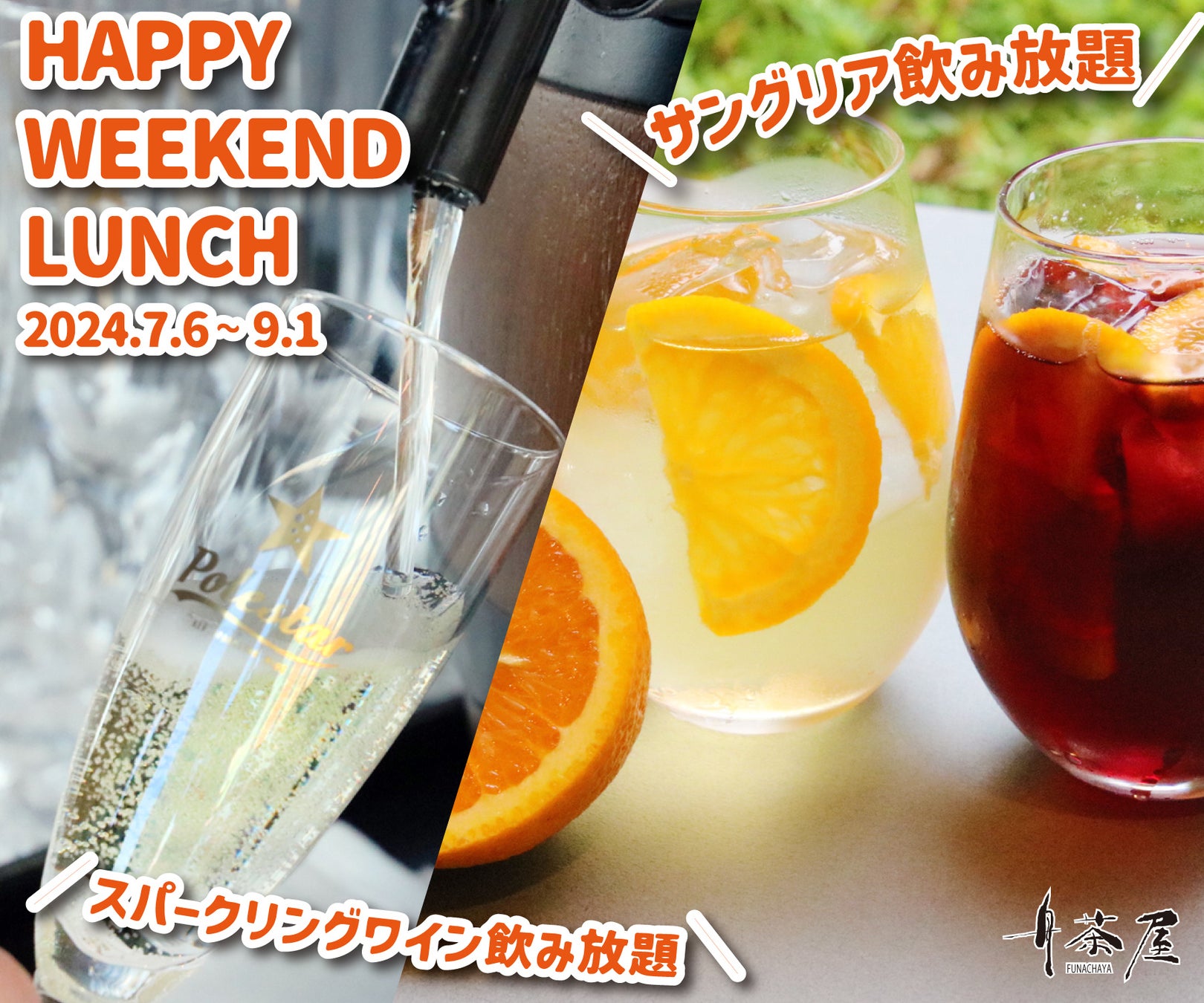 レストラン舟茶屋でお食事メニューとセットで楽しむ特別なドリンクサービス。土日祝日ランチに、樽詰スパークリングワインとサングリアのフリーフロー!
