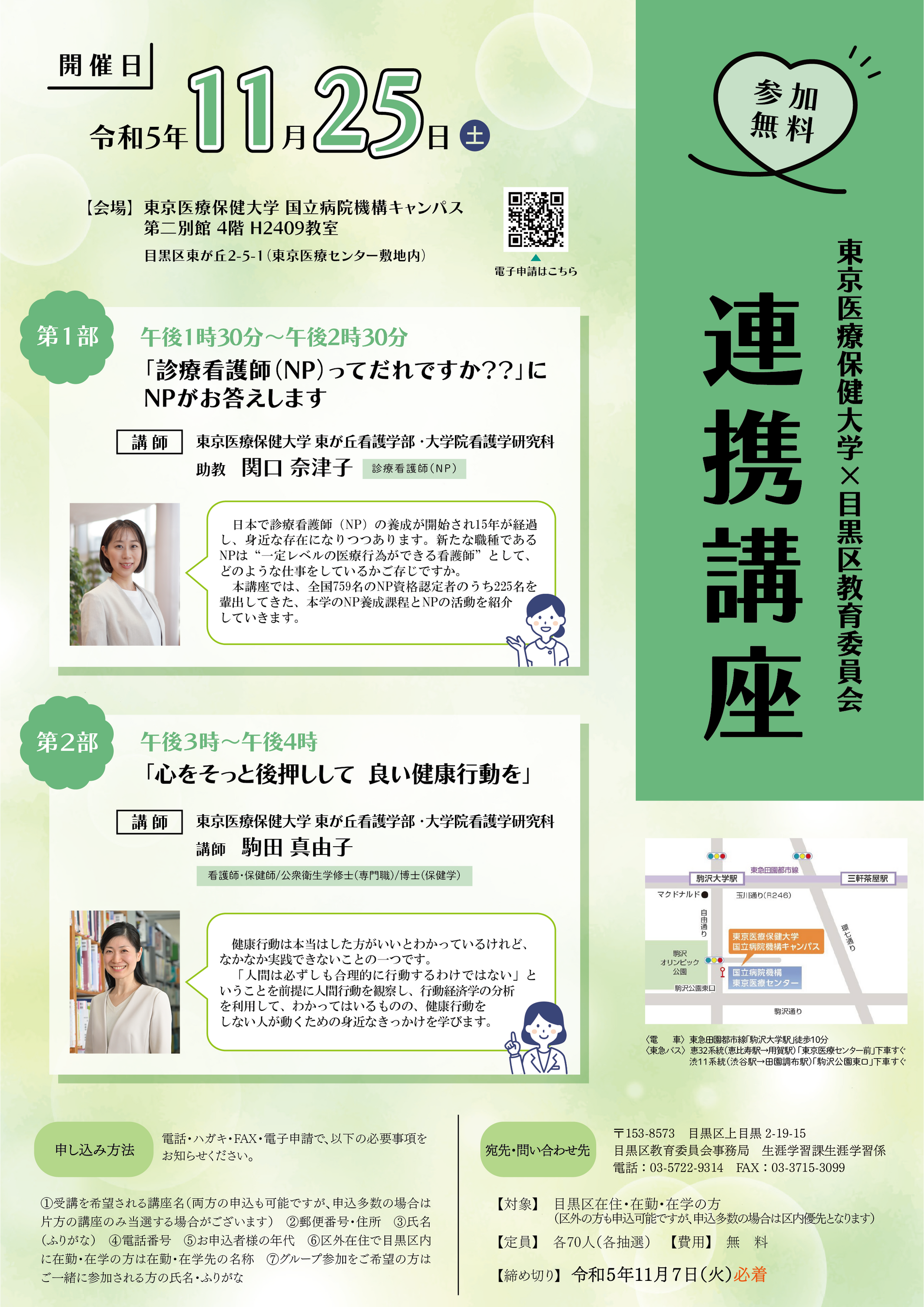 学校法人 青葉学園が運営する東京医療保健大学(本部:東京都品川区、理事長:田村哲夫、学長:亀山周二、以下「本学」) は、目黒区教育委員会と共催で連携講座『「診療看護師(NP)ってだれですか??」にNPがお答えします』『心をそっと後押しして 良い健康行動を』を2023年11月25日(土)に開催します。