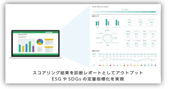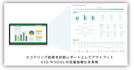 未上場企業のESGやSDGs、サステナビリティに向けた取り組み状況などの非財務情報を定量指標化(スコアリング)し、分析結果をレポート化する診断サービスです。本サービスでは、ヒアリング内容をもとに、数千社の上場企業数値と比較をした相対評価数値で企業様の現状を数値化いたします。
