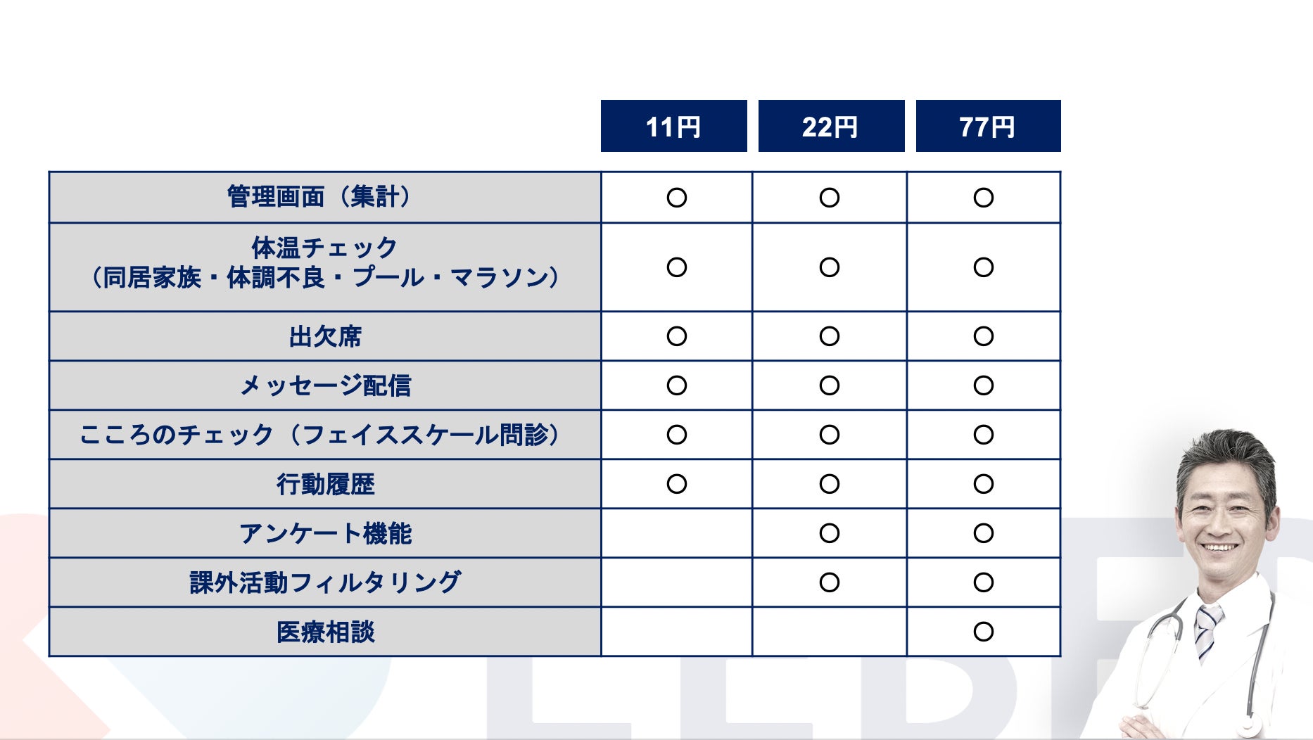児童・生徒側(保護者側)は、アプリを通じて登録、学校側(管理者側)は、専用の管理システムを利用します。料金は1名11円/月となっており、手頃なコストで生徒の健康管理に貢献し、同時に教職員の集計の手間を大幅に省くことが可能です。教職員が健康観察票など紙で集計する手間を大幅に省くことが可能で、学校全体の体温・体調の状況をグラフなどで確認できます。
