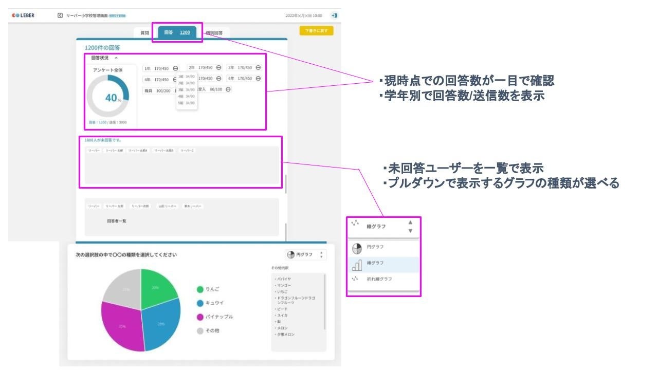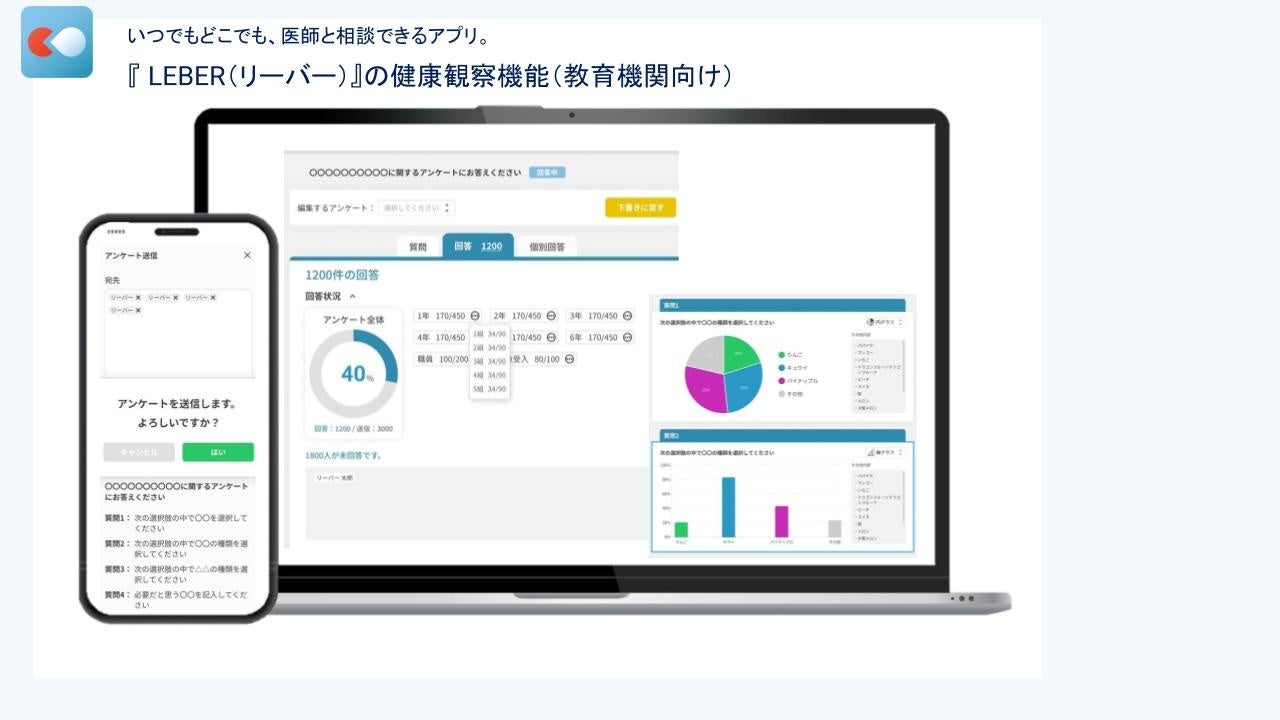 また、デジタル化を進める背景として教職員の働き方にも課題があると言われています。文部科学省が発表した「学校の働き方改革のための取組状況調査」によると、小学校教職員の「時間外勤務月45時間以下」の割合は2019年度と比較すると約2~16%増加、中学教職員の「時間外勤務月45時間以下」の割合は約4~14%増加、高校教職員の「時間外勤務月45時間以下」の割合は、約8~14%増加と教職員の時間外勤務が増加していることがわかりました。(*2)2020年4月にサービスを開始したLEBER for Schoolの機能は、児童・生徒の体温・体調の記録と報告をセットにした簡易的なサービスでしたが、保護者・先生の要望により、これまで様々な機能を追加して参りました。授業以外の業務が多い教職員の負担軽減と校務効率化の一助となれるようアプリ内で完結できるアンケート機能を追加いたしました。