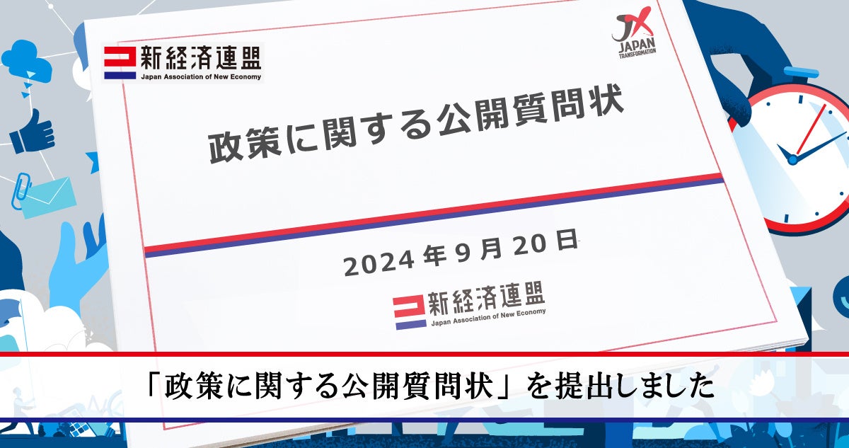 ⼀般社団法⼈新経済連盟(所在地︓東京都港区、代表理事︓三⽊⾕浩史)は、2024年9⽉20⽇、「政策に関する公開質問状」を自由民主党総裁選および立憲民主党代表選挙の各候補者宛てに提出しました。