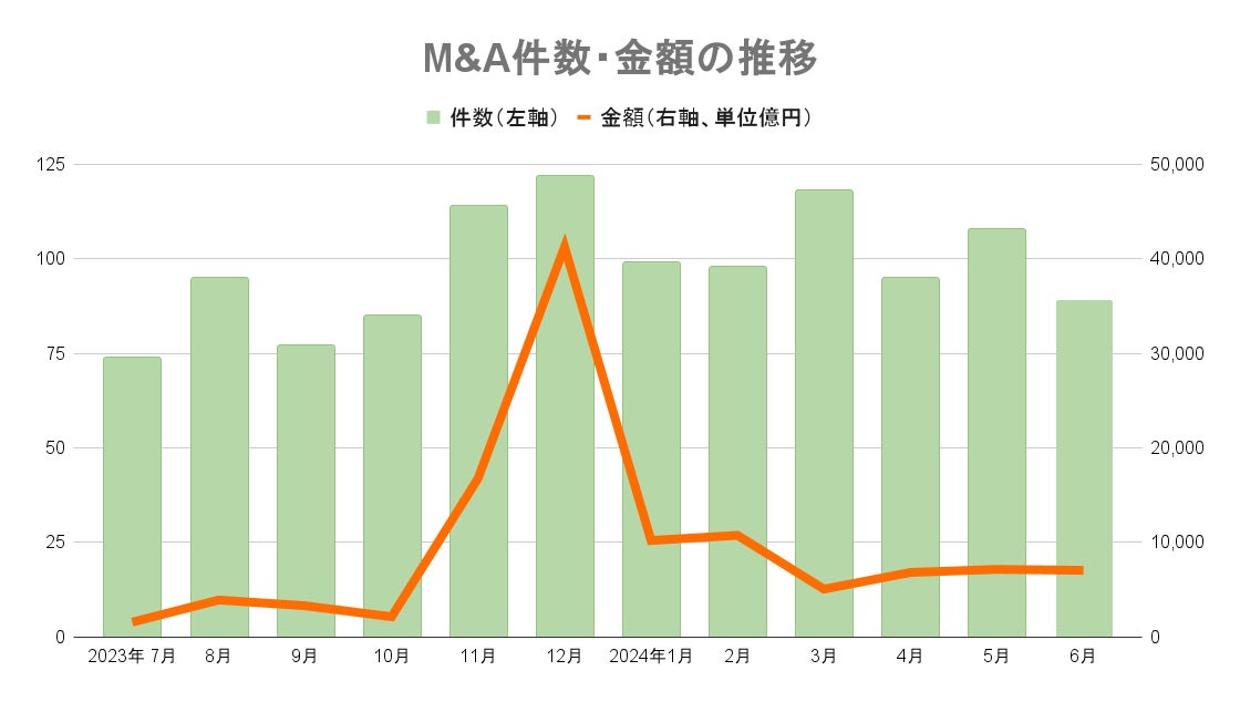 2024年6月のM&A件数(適時開示ベース)は、89件と前年同月を37件上回り、6月単月では過去10年で最多となりました。前年同月を上回るのは9カ月連続。取引金額は1000億円超の大型案件が二つ出たことで7051億円(公表分を集計)まで伸びました。また、2024年上半期を終えた段階で、累計件数は前年同期よりも106件多い607件で、M&Aが過去最高のペースで推移しています。