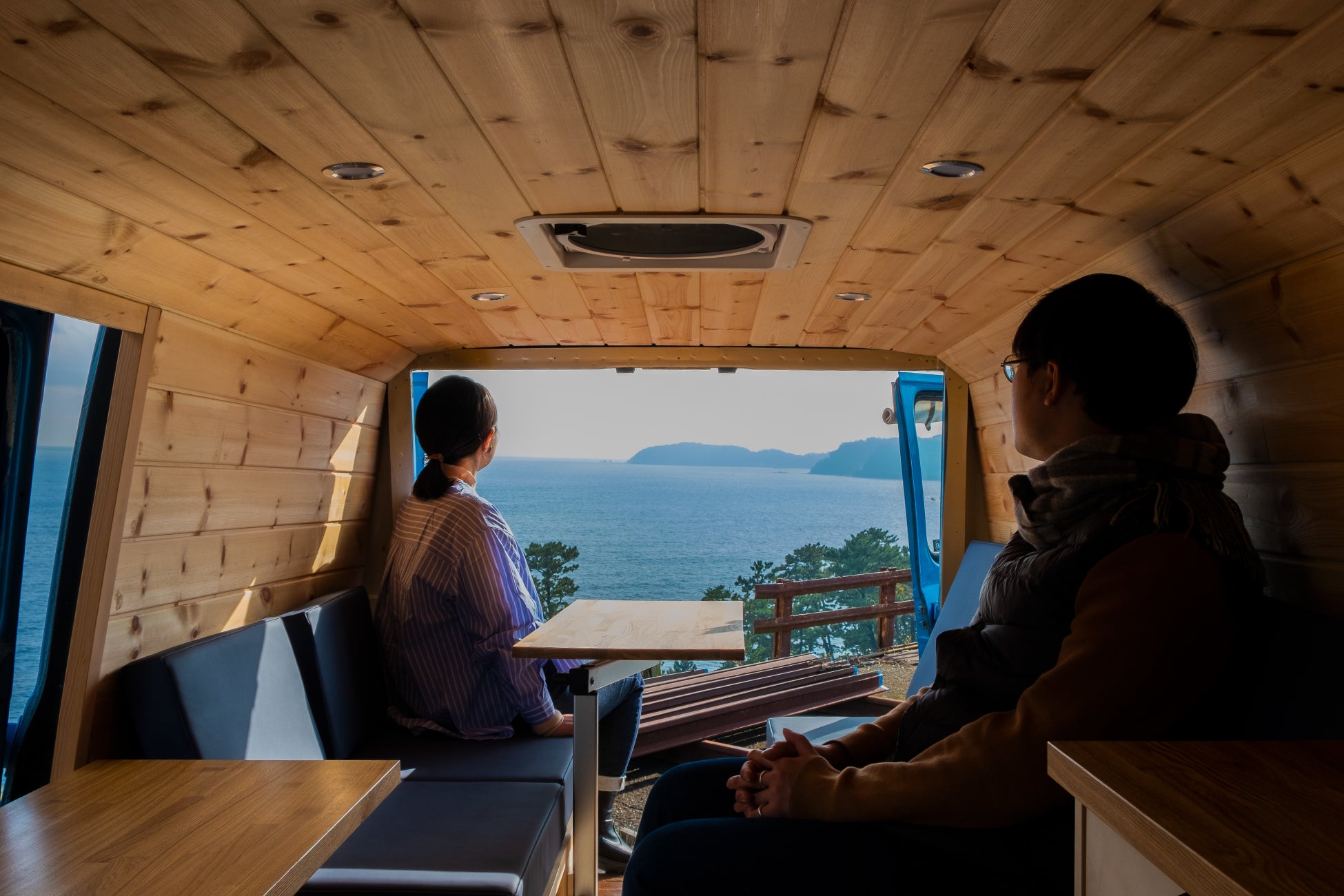 ➀カスタムVAN、タイニーハウス、キッチンカーを使用した、即席コンドミニアムで根府川駅に滞在