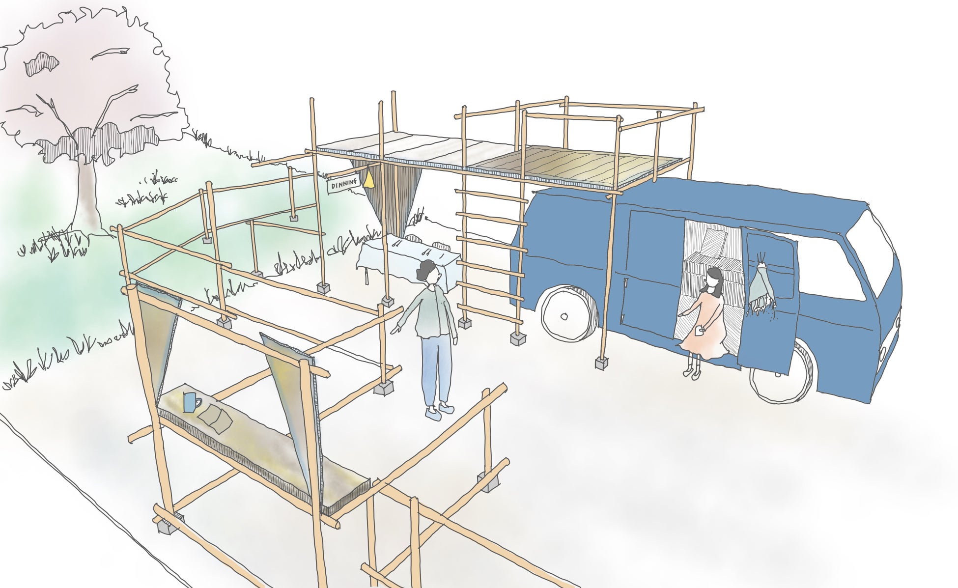 内容:①カスタムVAN、タイニーハウス、キッチンカーを使用した、即席コンドミニアムで根府川駅に滞在
