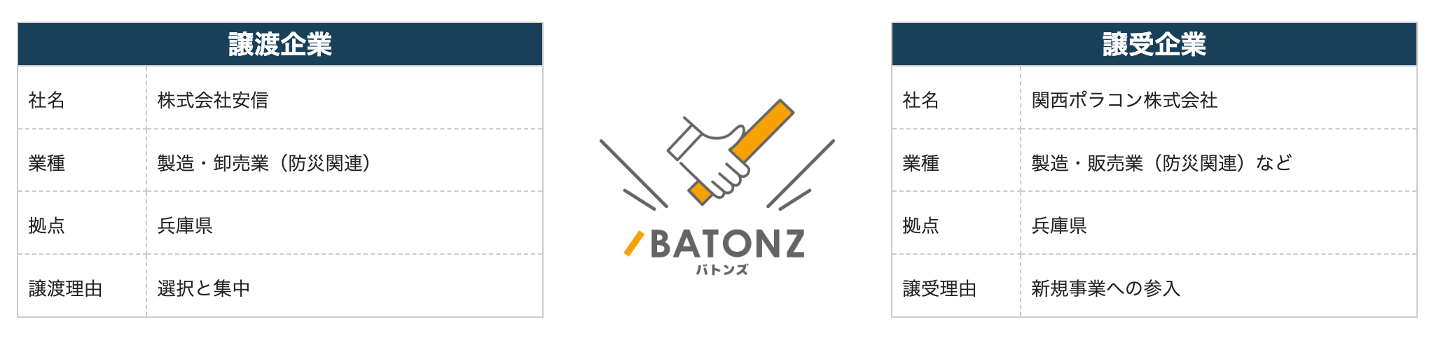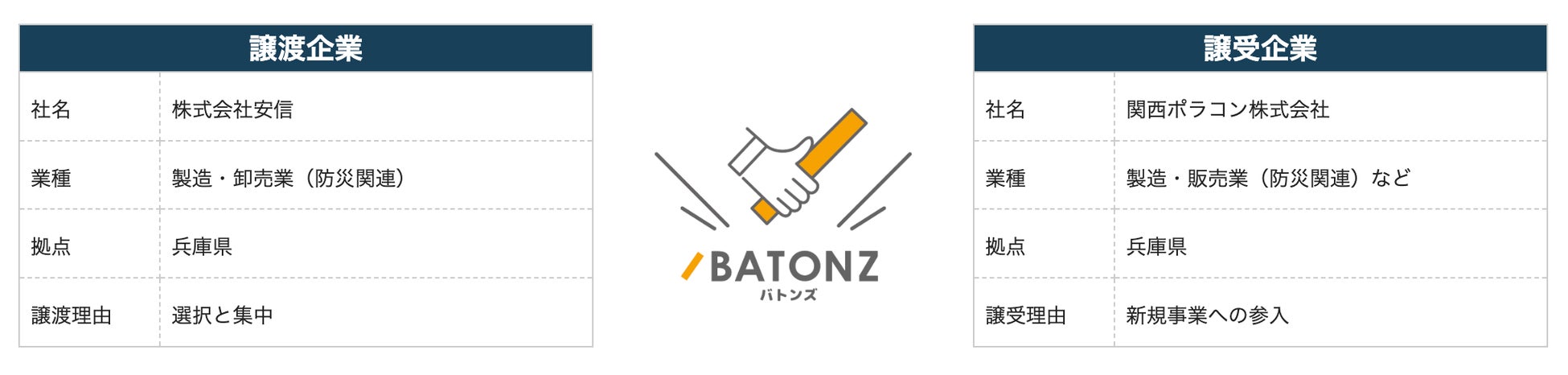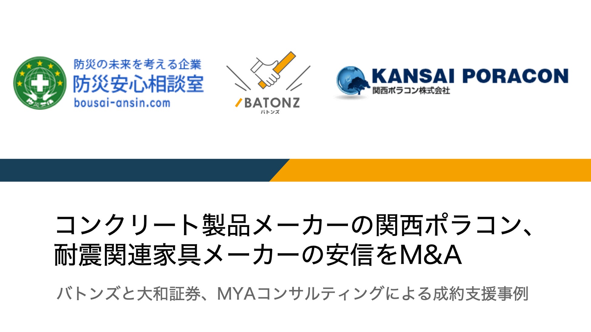 M&A総合支援プラットフォーム「BATONZ(バトンズ)」を運営する株式会社バトンズ(本社:東京都千代田区、代表取締役:神瀬悠一、以下バトンズ)は、大和証券株式会社(本社:東京都千代田区、代表取締役社長:中田誠司、以下大和証券)及び、株式会社MYAコンサルティング(本社:兵庫県神戸市、代表取締役:宮島健、以下MYAコンサルティング)とともに、関西ポラコン株式会社(本社:兵庫県丹波市、以下関西ポラコン)と、株式会社安信(本社:兵庫県神戸市、以下安信)のM&A成約を支援したことをお知らせします。