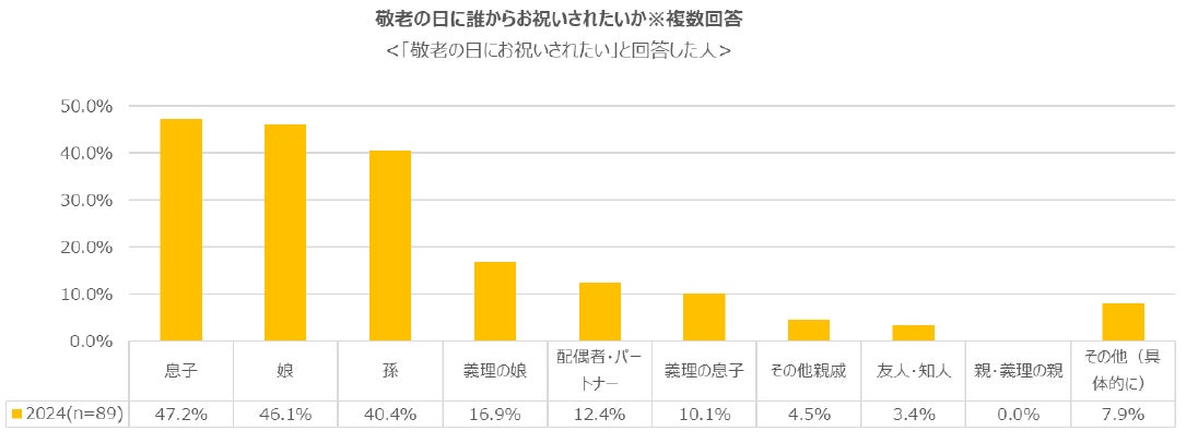 「敬老を祝われたい」相手は「息子」「娘」「孫」が高く、「配偶者・パートナー」も12.4%いた。