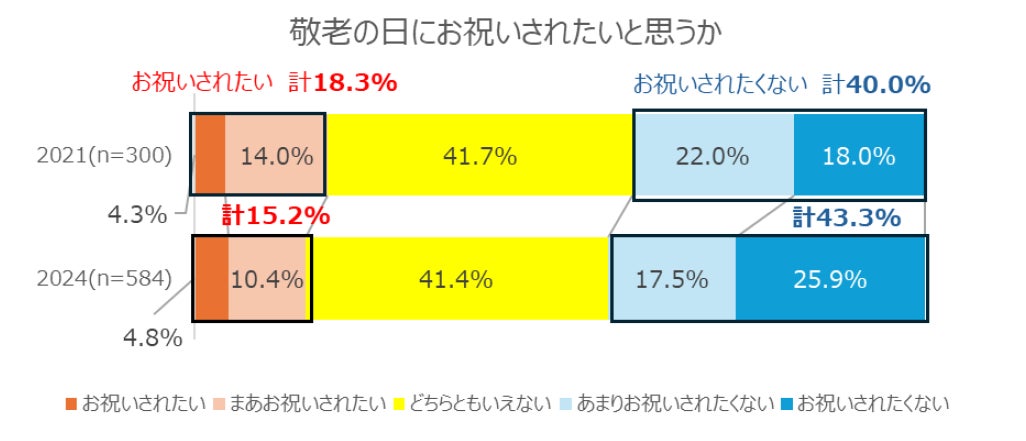 「敬老の日にお祝いされたい」(お祝いされたい+まあお祝いされたい)は2021年18.3%、2024年は15.2%で3ポイント減。逆に「お祝いされたくない」(あまりお祝いされたくない+お祝いされたくない)は40.0%から43.3%と3ポイント増。
