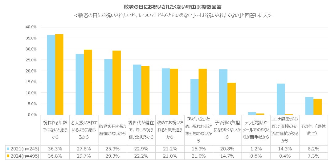 「お祝いされたくない(お祝いされたくない+あまりお祝いされたくない+どちらともいえない)」理由は「祝われる年齢ではないと思うから」「老人扱いされているように感じるから」「敬老の日を祝う習慣がないから」が高く、いずれも前回よりやや増。
