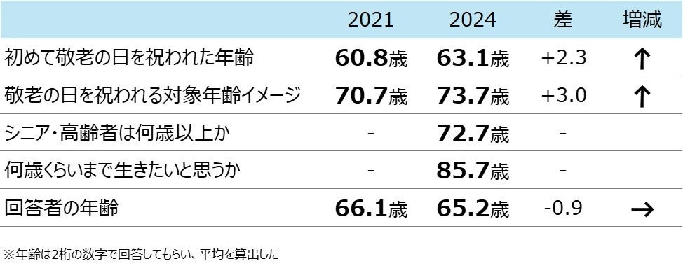 初めて敬老の日を祝われた年齢は平均63.1歳、対象イメージは73.7歳で10歳のギャップ。いずれも3年前より2~3歳アップ。