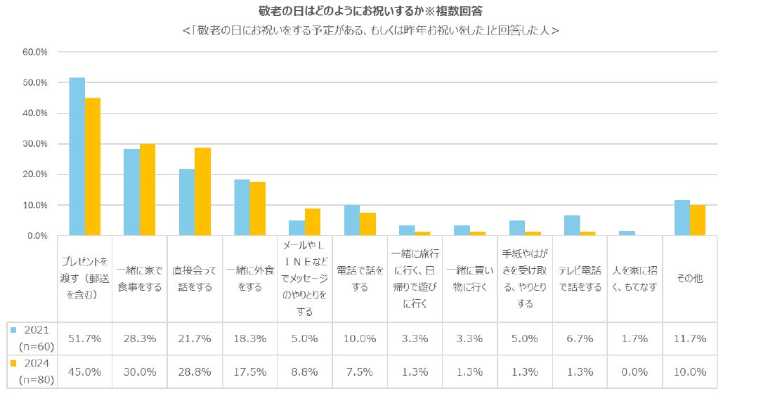 「今年の敬老の日にお祝いをする予定がある」(2021年は「昨年お祝いした人」も含む)と答えた人に内容を聞いたところ、最も高いのは「プレゼントを渡す(郵送を含む)」。次いで「一緒に家で食事をする」「直接会って話をする」など。
