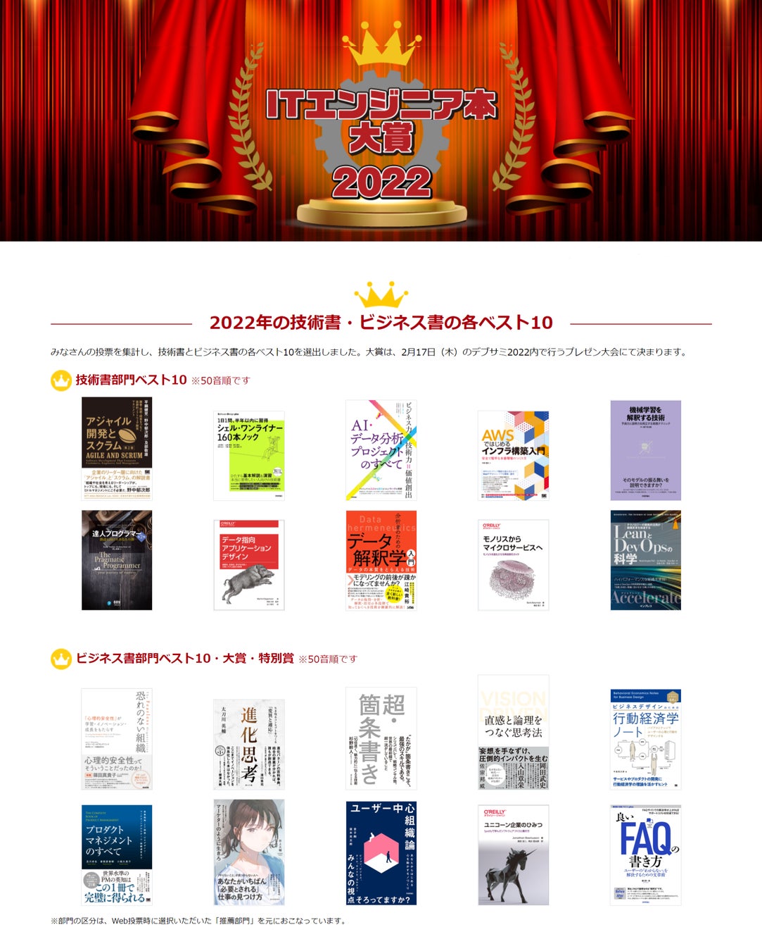 ITエンジニア本大賞2022、技術書・ビジネス書の各ベスト10を発表!大賞は、2/17総合ITカンファレンスDevelopers Summit 2022内で行うプレゼン大会で決定