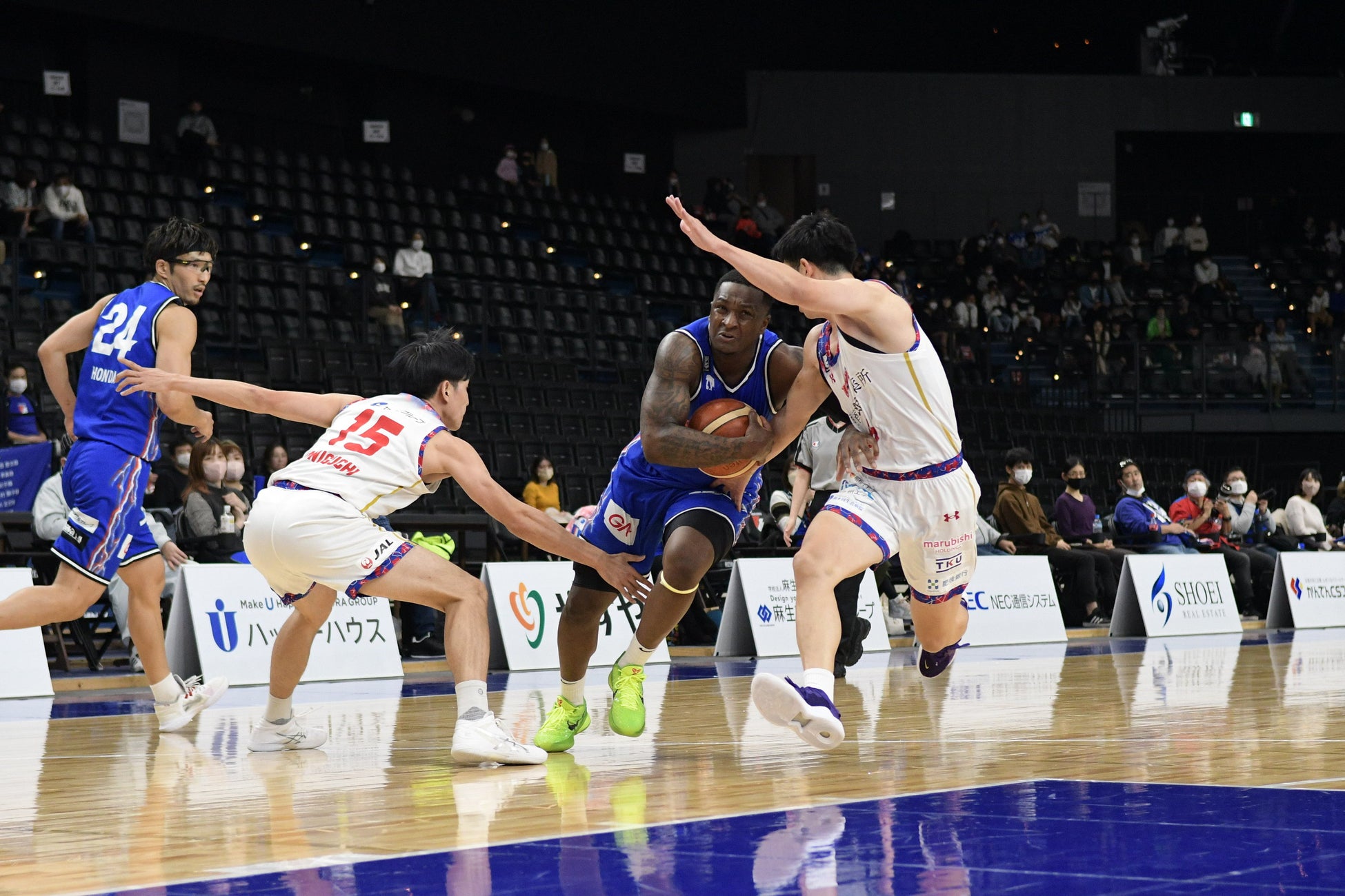 後半に入っても両者譲らない点を取り合う展開になる。福岡は♯18菅のジャンプシュートが決まると徐々に流れを掴み#23ハリスが3Pシュートを成功させ逆転に成功し、一時リードを奪うもターンオーバーから連続で失点し終盤に大きくリードを奪われる。#7グリンの4点プレーで最後まで諦めずゴールを狙ったが一歩及ばず悔しい敗戦を喫した。