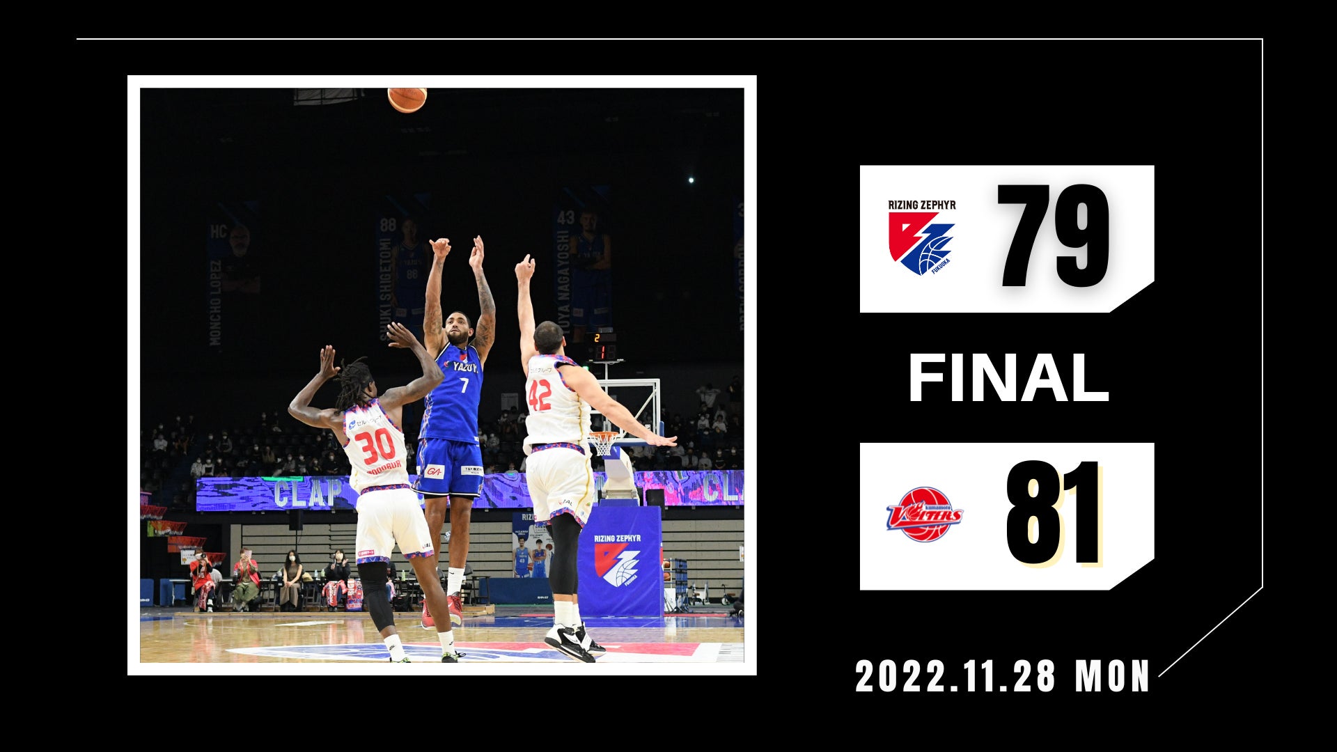 2022年11月28日(月)に開催されましたBリーグ第9節【ライジングゼファーフクオカvs.熊本ヴォルターズ】において“福岡79-81熊本”の結果となりましたことお知らせいたします。